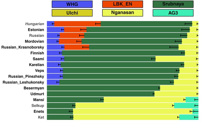 2019년 유전학, 고고학, 언어학을 기반으로 한 연구에서 우랄어를 사용하는 사람들이 철기 시대 초에 시베리아, 특히 시베리아에서 발트 지역으로 이동했으며, 응가나산인 관련 구성 요소와 함께 우랄어의 확산과 연관되었을 가능성이 있다는 것을 발견했다.[35]