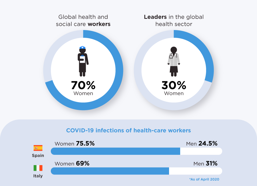 여성 의료 종사자는 특정 유형의 직장 관련 건강 문제와 스트레스에 직면할 수 있다. 세계 보건 기구(WHO)에 따르면, 많은 국가에서 여성이 공식 의료 인력의 다수를 차지하며, 환자를 들어 올리거나 옮기는 등 신체적으로 힘든 업무로 인해 근골격계 부상과 소진에 취약한 경향이 있다. 또한, 직장에서 유해 약물이나 화학 물질에 노출될 경우 유산이나 선천적 기형과 같은 생식 건강상의 부정적인 결과를 겪을 위험이 있다. 일부 경우에는 동료나 환자로부터 성별에 기반한 폭력의 대상이 되기도 한다.[38][39]