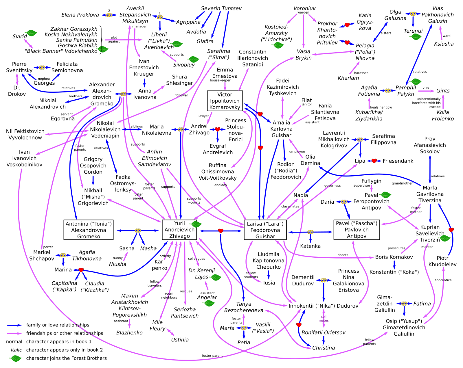 소설 《의사 지바고》는 많은 등장인물이 복잡하게 얽혀 있고, 한 인물이 여러 이름이나 애칭으로 불리는 경우가 있어 줄거리를 따라가기 어려울 수 있다.[4]