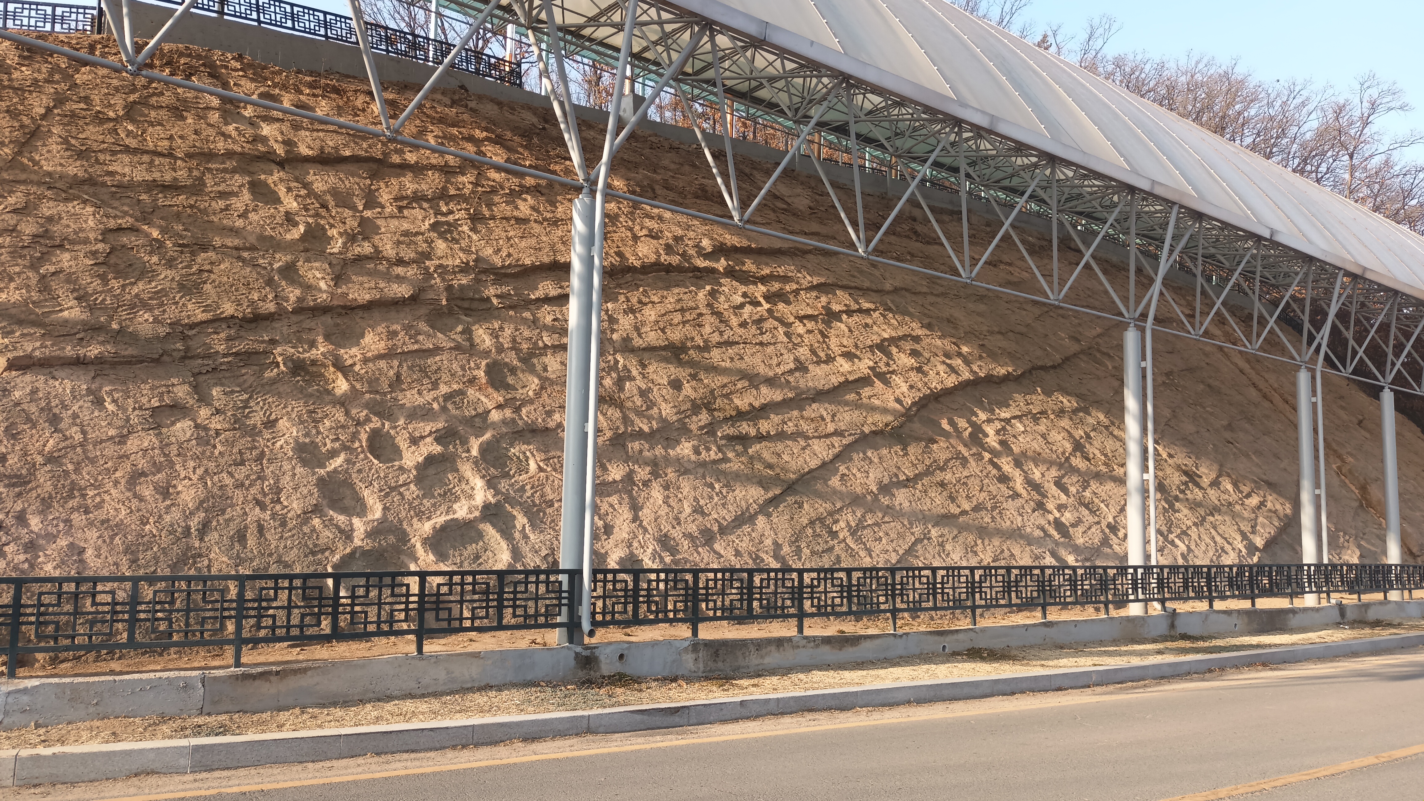 1977년 4월 초 군위 지질도폭 조사 당시 금성면 탑리 남서쪽 1.5 km 옹기도마고개 도로변의 후평동층 구계동층원에서 용각류(龍脚類; Sauropoda)에 속하는 거대한 고생물의 지체(肢體)의 일부인 지골(肢骨; 팔, 다리뼈) 화석이 발견되었다. 화석 산지는 금성면 청로리 산 137번지 4호 내에 위치하며, 발굴된 화석은 최대 장축 43 cm, 길이 41 cm의 지골편(肢骨片; 팔·다리뼈 조각)이다. 뼈 화석 표면에는 근육, 힘줄 등이 붙어 있었던 것으로 보이는 규칙적이고 정교한 조선(條線)과 기복들이 보존되어 있었다. 본 화석은 구계동층 하한에서 약 60 m 상위에 산출되며 화석을 포함하는 회색 역암층의 역(礫)들의 대부분은 석회질 단괴이다. 화석이 산출된 역암층은 도로변에 렌즈상 단면으로 드러나 있으며 두께는 최대 1 m이다.[1][8]