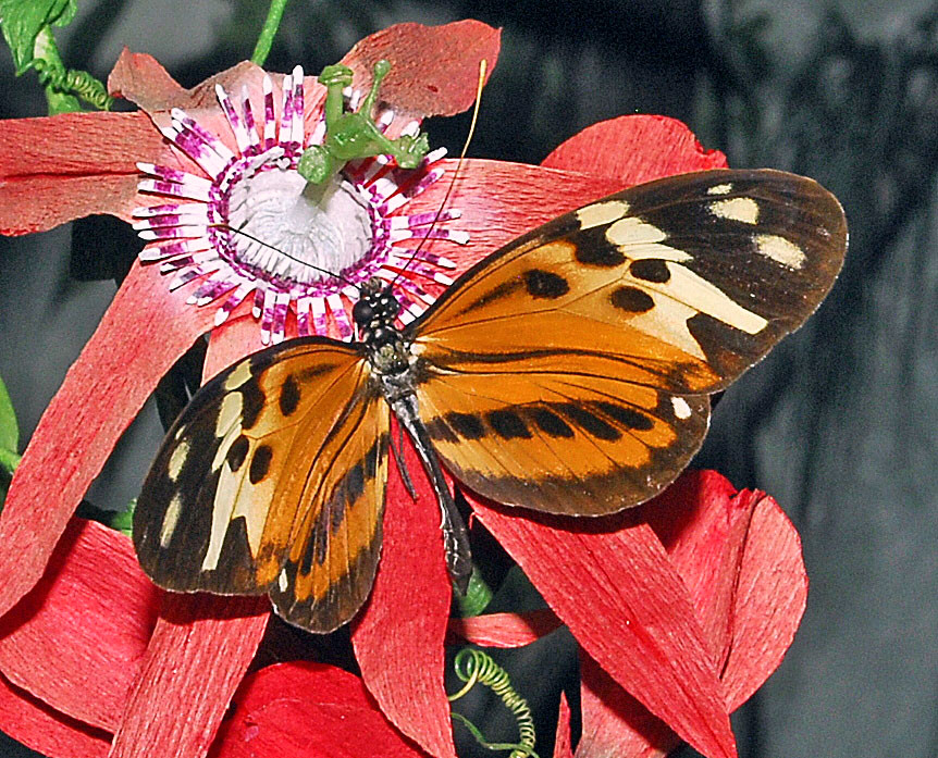 길버티안 의태(Gilbertian mimicry)는 양극성으로, 두 종만 관여한다. 잠재적 숙주(또는 먹이)는 기생충(또는 포식자)을 모방하여 쫓아내는데, 이는 숙주-기생충 공격적 의태의 반대이다. 이는 파스퇴르가 이러한 희귀한 의태 시스템을 나타내는 구절로 만들어낸 용어이며,[30] 1975년에 이를 설명한 미국 생태학자 로렌스 E. 길버트의 이름을 따서 명명되었다.[61] 길버티안 의태의 고전적인 예는 ''시계꽃속'' 식물 속에 있는데, 이는 일부 ''헤리코니우스속'' 나비의 미소포식자 유충이 갉아먹는다. 숙주 식물은 부화 직전의 ''헤리코니우스'' 나비 알을 모방하는 턱잎을 진화시켰다. 나비는 기존 알 근처에 알을 낳는 것을 피하여 애벌레 간의 종내 경쟁을 줄인다. 애벌레는 또한 동족을 잡아먹는 성향이 있으므로, 빈 잎에 알을 낳는 나비는 자손의 생존 확률을 높인다. 따라서 턱잎은 이러한 애벌레의 선택 압력 하에서 나비 알을 길버트 모방한 것으로 보인다.[30][62]