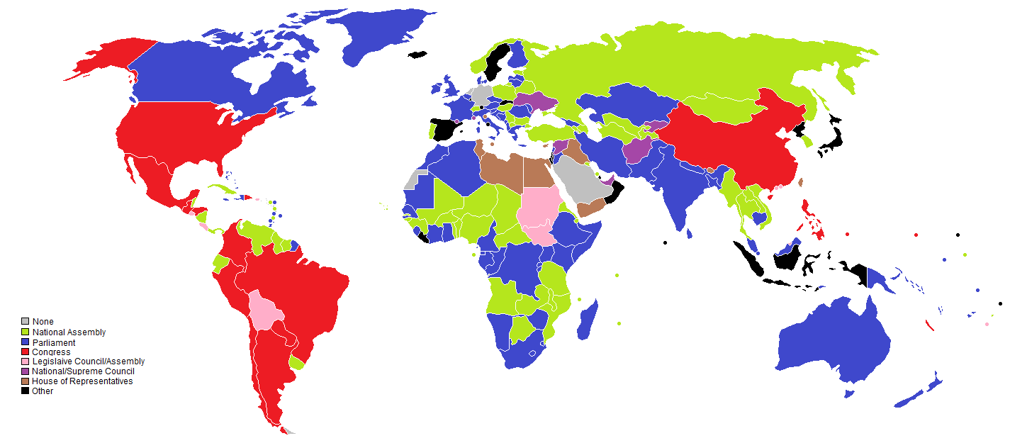 각국의 의회 명칭에는 각각의 역사와 경위가 포함되어 있다.[63] 다음은 주요 명칭의 영어 표기, 주요 채택국, 어원이다.