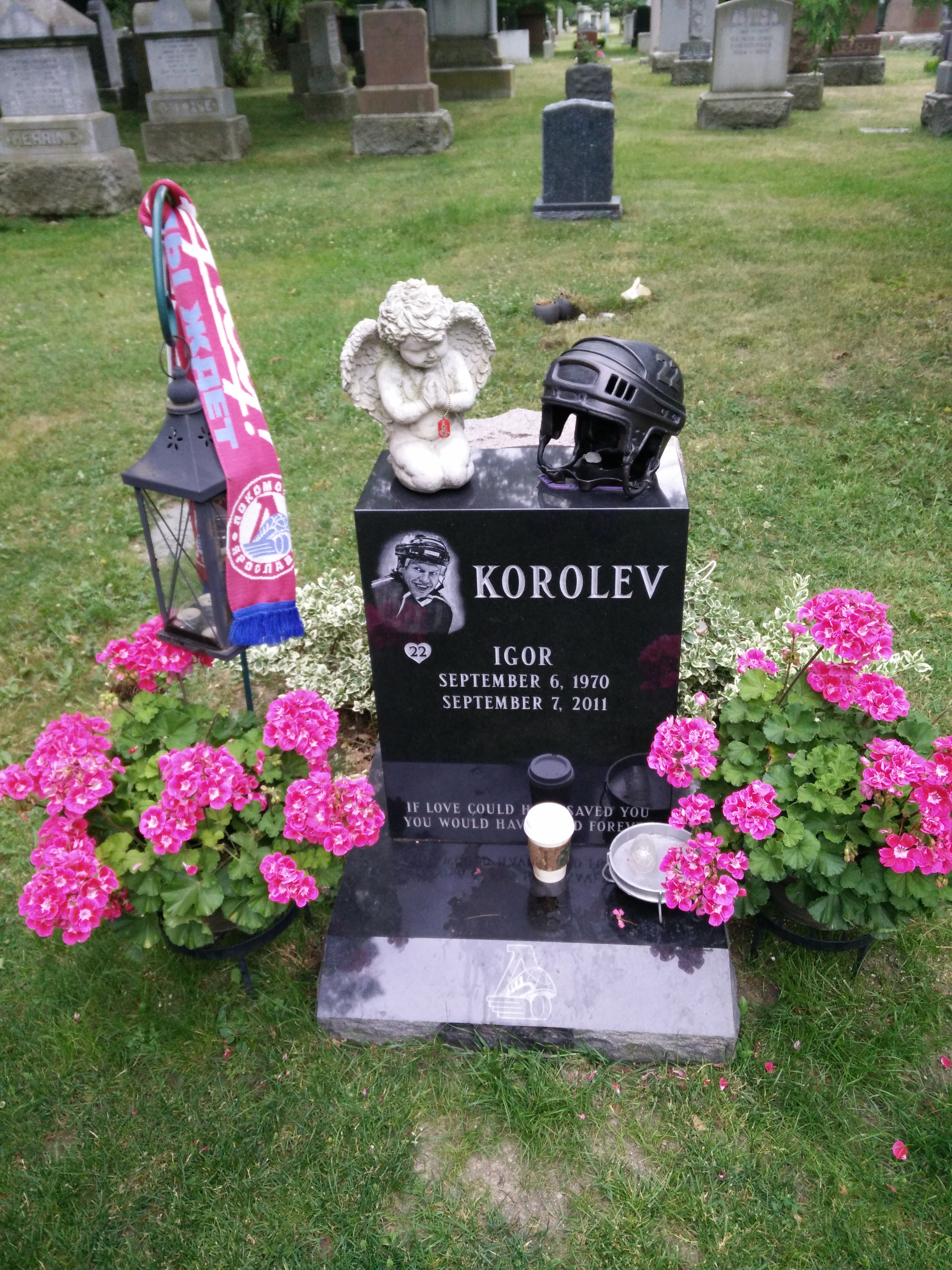 토론토 마운트 플레전트 묘지에 있는 이고르 코롤료프의 묘. 꽃과 기념품으로 장식되어 있다.