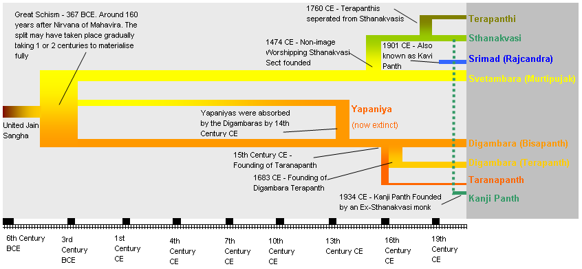 자이나교의 첫 번째 분열은 기원전 4세기경에 발생하여 디감바라와 스베탐바라라는 두 개의 주요 종파가 생겨났으며, 이후 더 세분화되었다.