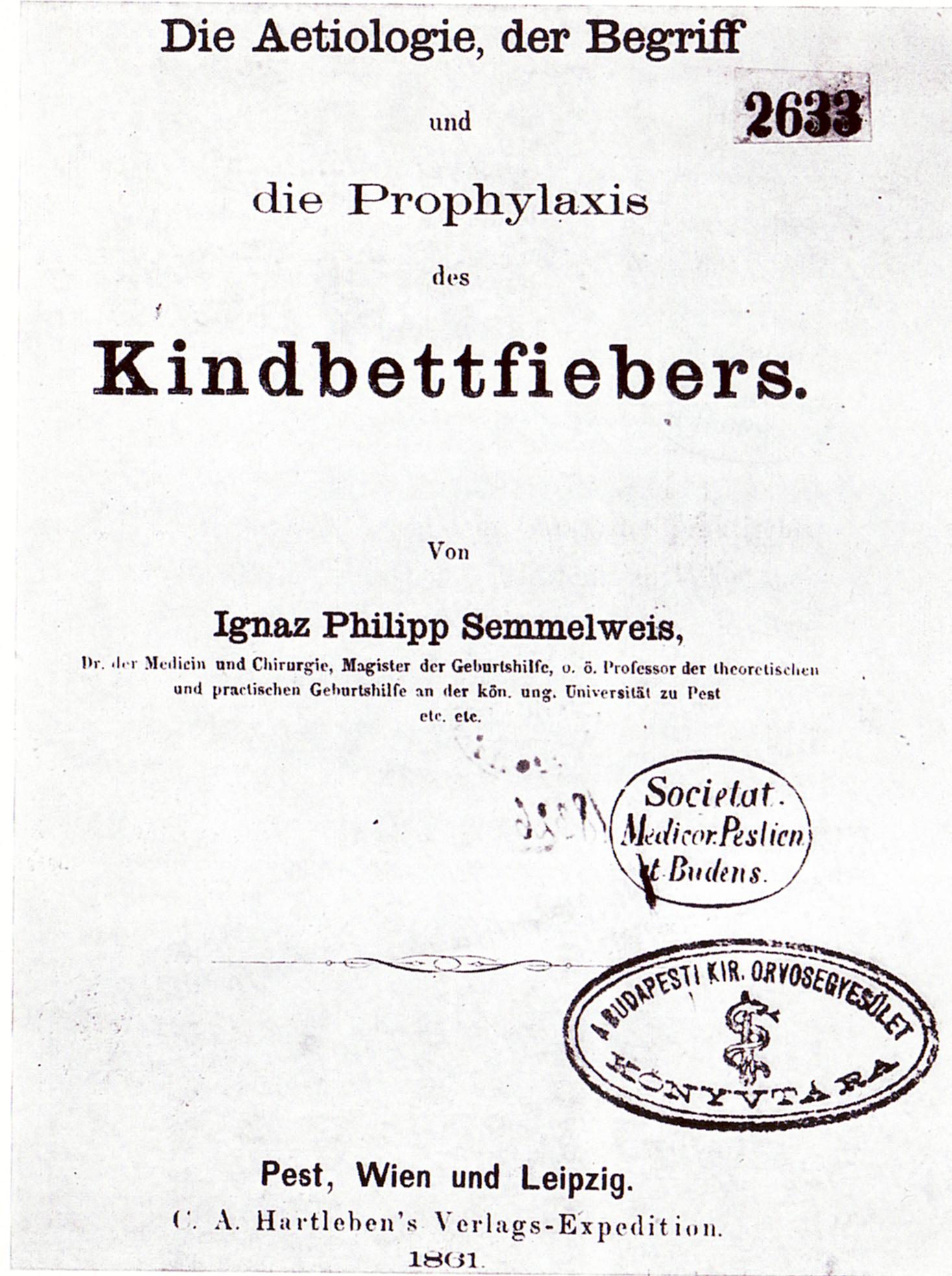 젬멜바이스의 주요 저서: ''Die Ätiologie, der Begriff und die Prophylaxis des Kindbettfiebers'', 1861년 (표지)