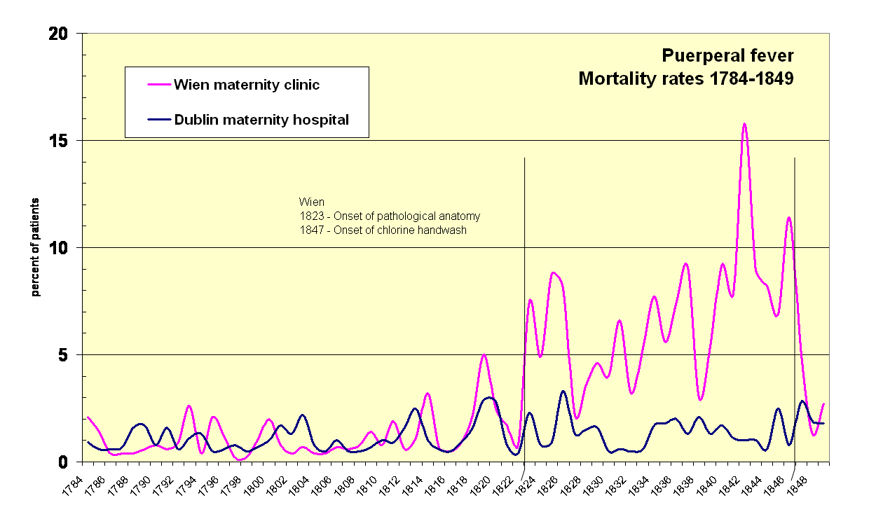 1861년 저서에서 젬멜바이스는 빈에서 1823년 병리해부학 도입 이후 산욕열 발생률이 증가했음을 보여주었다. 두 번째 세로선은 1847년 염소 소독제를 이용한 손씻기 도입을 나타낸다. 더블린 로툰다 병원의 통계는 비교를 위해 제시되었다.