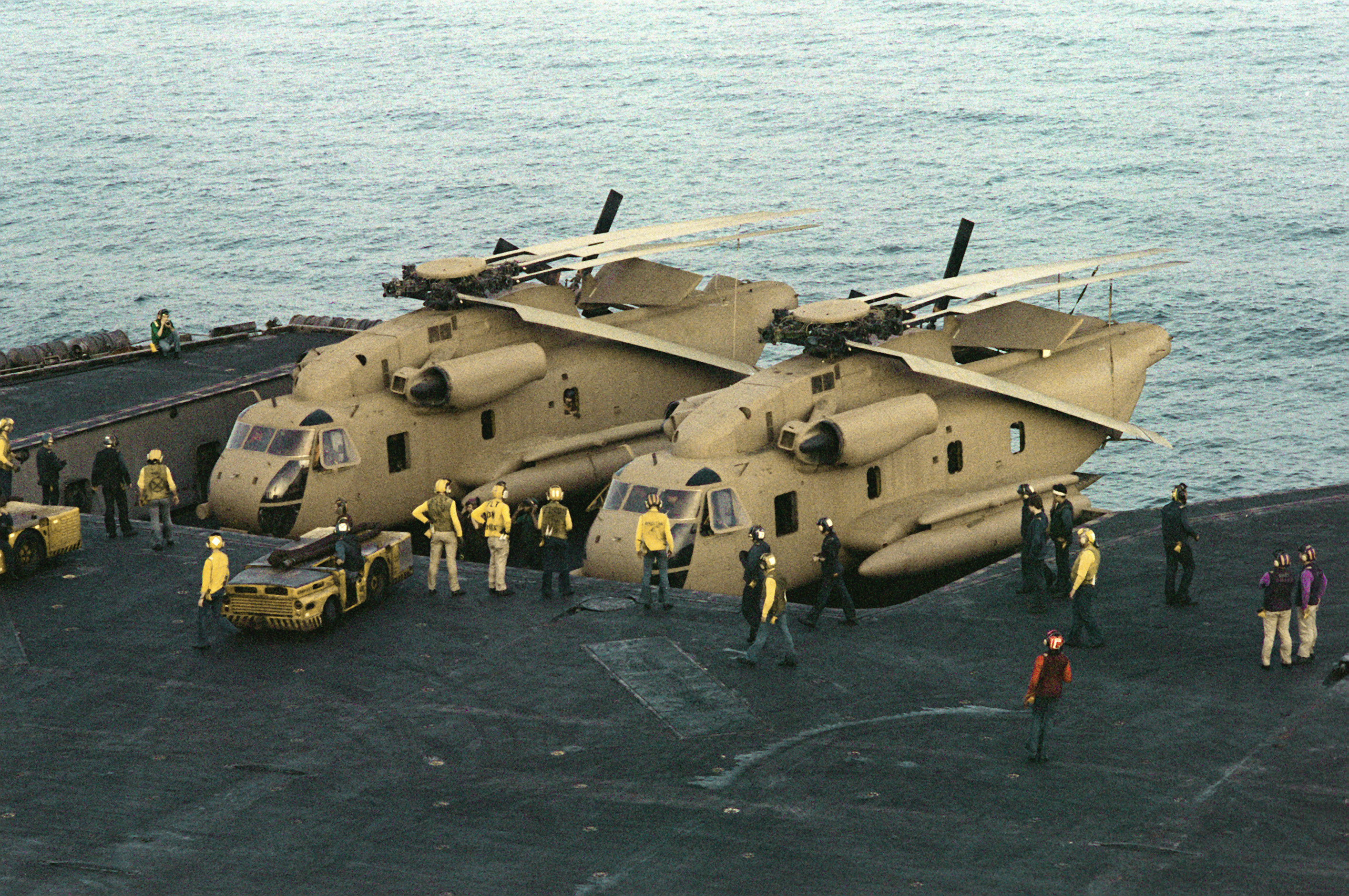 8대의 미국 해군(USN) RH-53D 시 스탤리온 헬리콥터는 에 배치되어 이란 해안에서 97km 떨어진 곳에 위치했다.[20] 헬리콥터는 "데저트 원"에 도착해 급유를 받고 델타 포스와 레인저 팀 일부를 태운 뒤, 420km를 더 비행하여 "데저트 투"로 향할 예정이었다.[21]