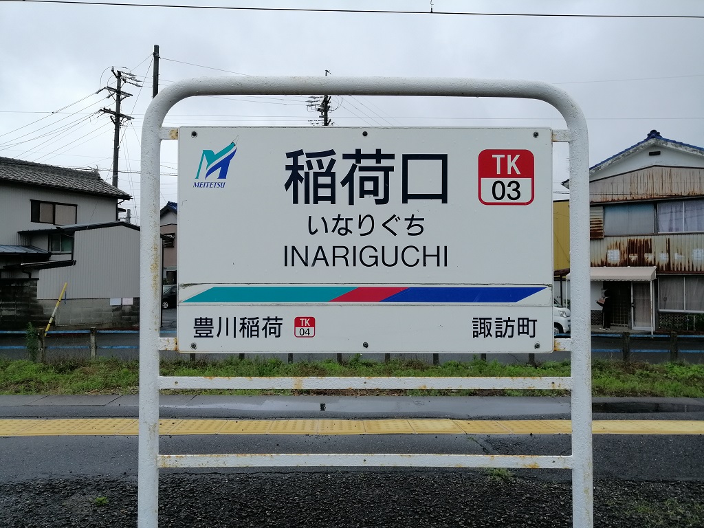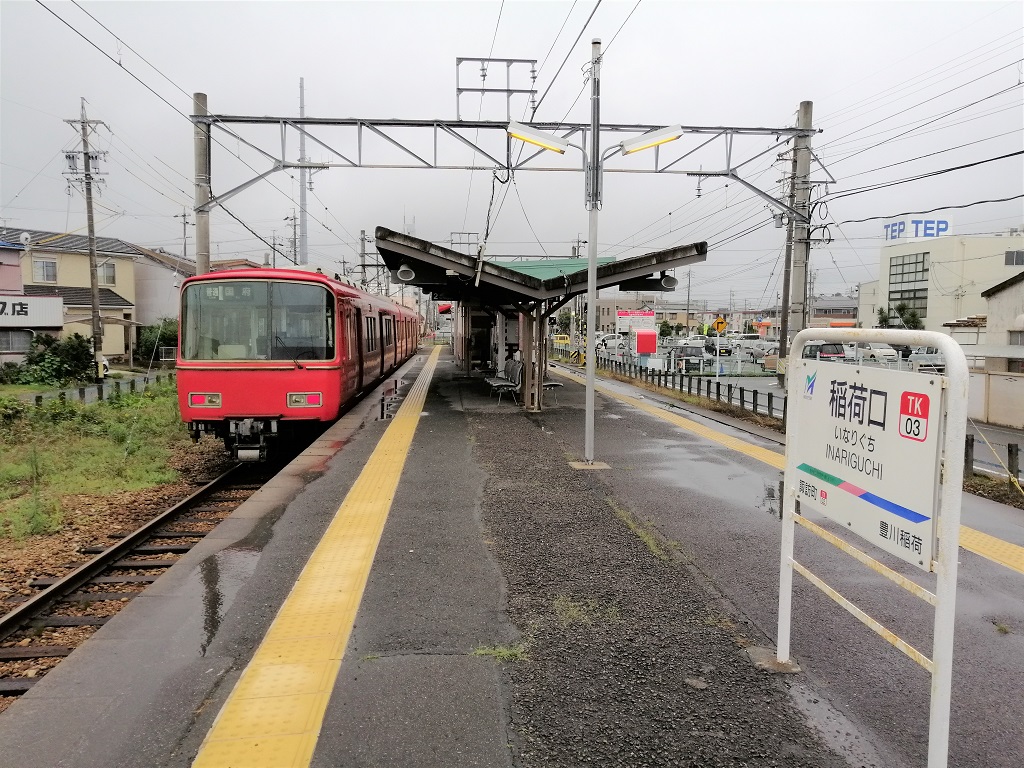 나고야 철도 도요카와선의 쾌속 특급, 특급, 급행, 준급, 보통 열차는 모두 스와초 역(TK02) - '''이나리구치 역'''(TK03) - 도요카와이나리 역(TK04) 순으로 정차한다.