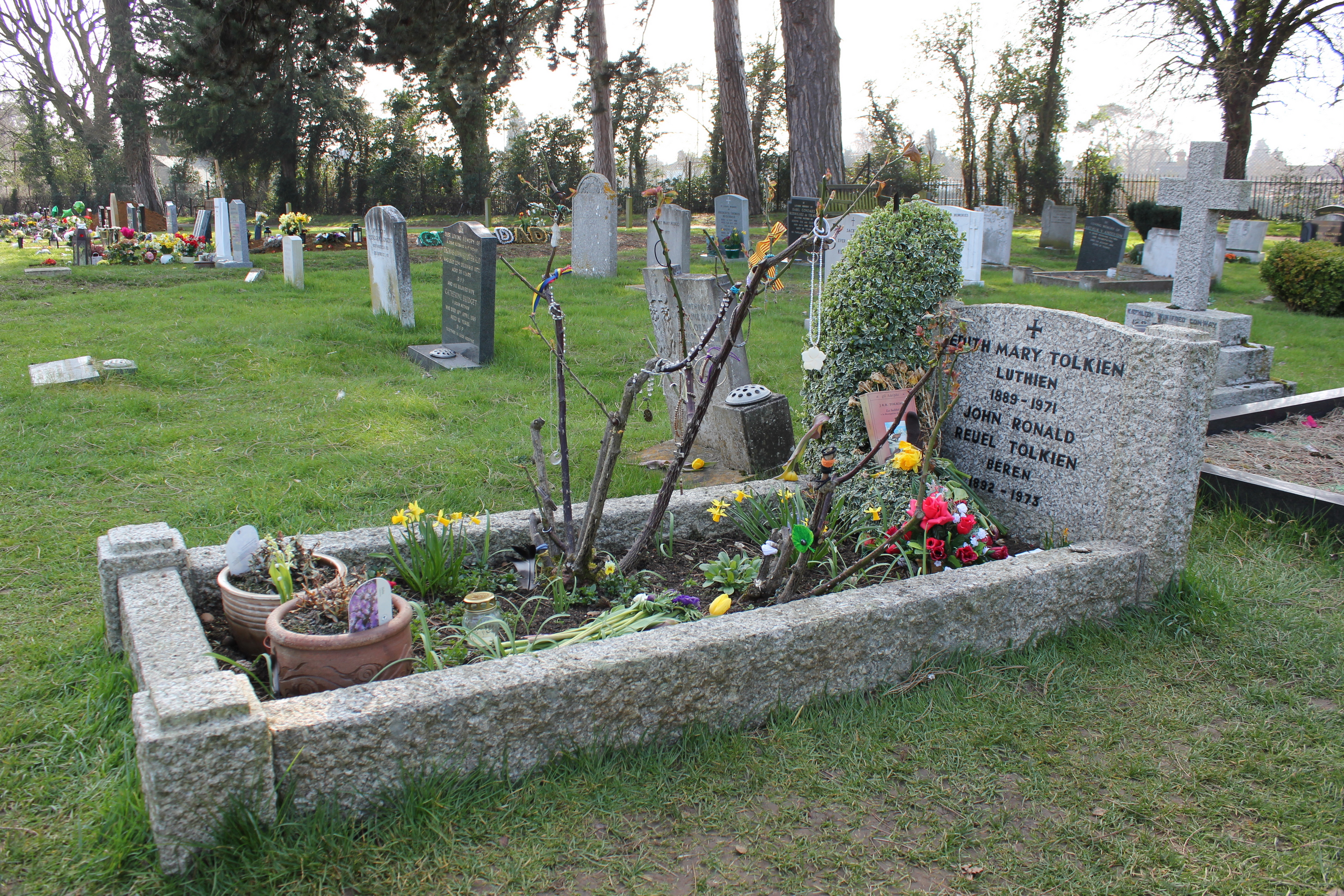 톨킨 부부의 묘비에는 베렌과 루시엔의 이름이 새겨져 있다. 중간계 전설집에서 루시엔은 모든 일루바타르의 자손 중 가장 아름다운 존재였으며, 필멸의 전사 베렌을 사랑하여 불멸을 포기했다. 베렌이 어둠의 군주 모르고스의 군대에 사로잡히자 루시엔은 말하는 사냥개 후안을 타고 그를 구출하러 갔다. 결국 베렌이 악마 늑대 카르카로스와의 전투에서 죽자, 루시엔은 오르페우스처럼 발라르 신들에게 다가가 사랑하는 이를 다시 살려달라고 설득했다.[15]