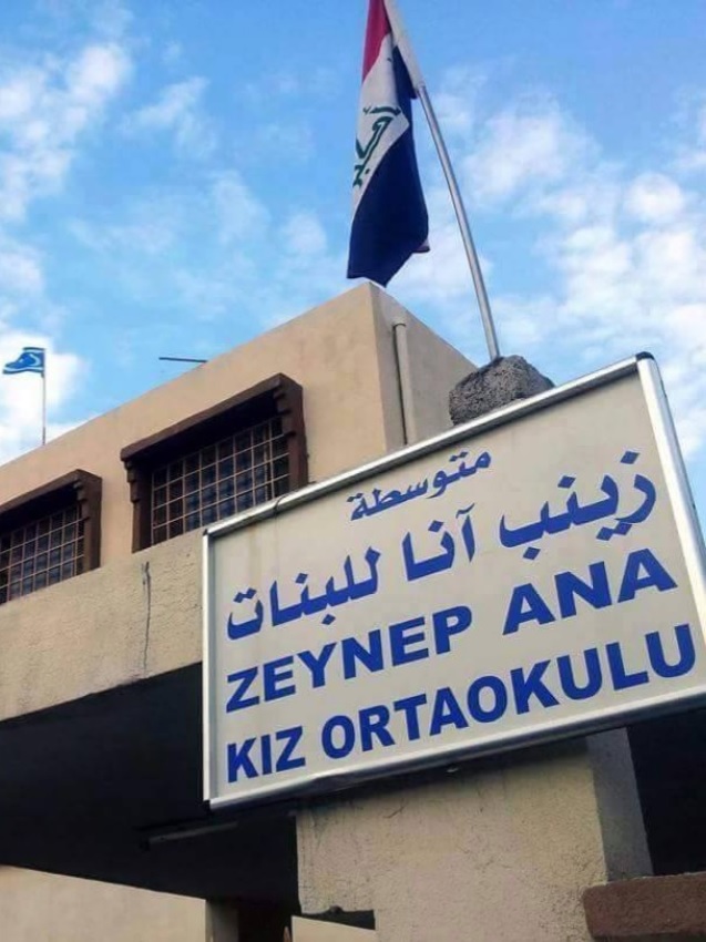 이중 언어 표지판(아랍어 및 터키어)의 이라크 투르크멘 여자 중학교