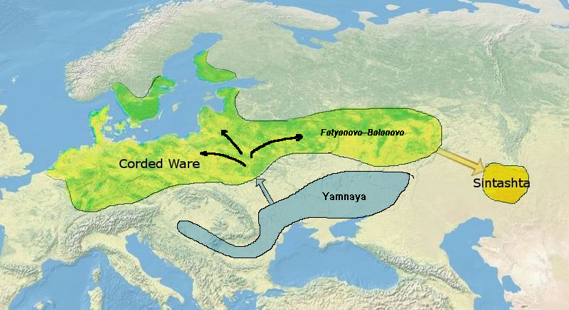 기원전 2100년에서 1800년 사이, 동유럽과 중앙 아시아 경계의 북부 유라시아 대초원에는 청동기 시대의 신타슈타 문화가 존재했다.[32][33] 이 문화는 인도-이란어파의 초기 확산과 관련된 고고학적 증거로 여겨진다. 신타슈타 문화는 우랄-토볼 대초원의 폴타브카 문화와 북쪽 숲 대초원의 아바셰보 문화의 영향을 받아 형성되었으며, 유전적으로는 전선 문화와 가까운 관계를 보인다.[34]신타슈타 문화는 세계에서 가장 오래된 전차 유적이 발견된 곳으로 유명하며, 이 기술은 구대륙 전역으로 퍼져나가 고대 전쟁의 양상을 바꾸었다.[35] 또한, 이들은 대초원 문화에서는 드물게 구리 채굴과 청동 야금술에 능숙했다.[36] 신타슈타 문화는 이후 안드로노보 문화와 구분되는 독자적인 문화로 인정받고 있다.[33]