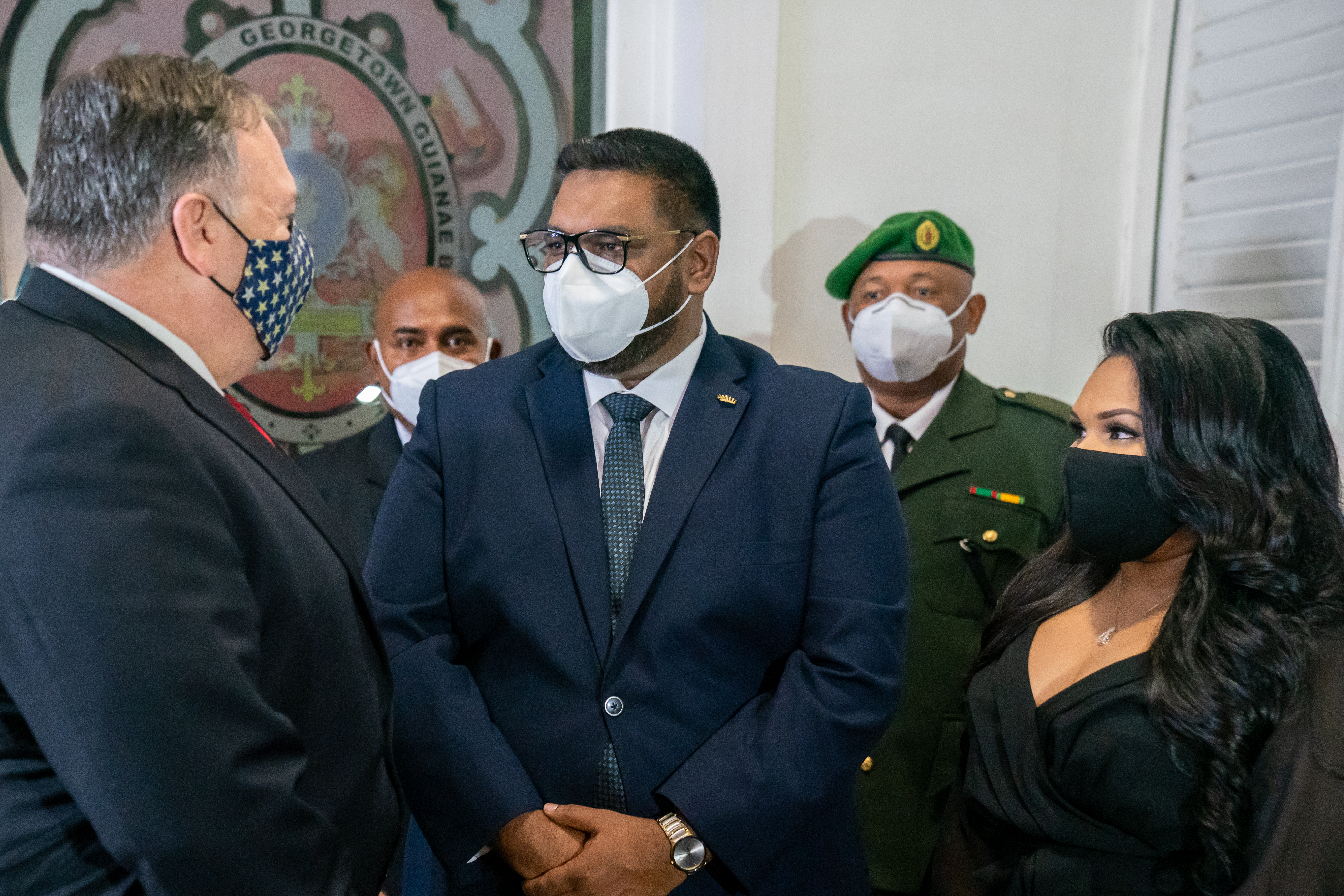 2020년 9월 가이아나에서 회담하는 이르판 알리 대통령(오른쪽)과 마이크 폼페이오 미국 국무장관(왼쪽)