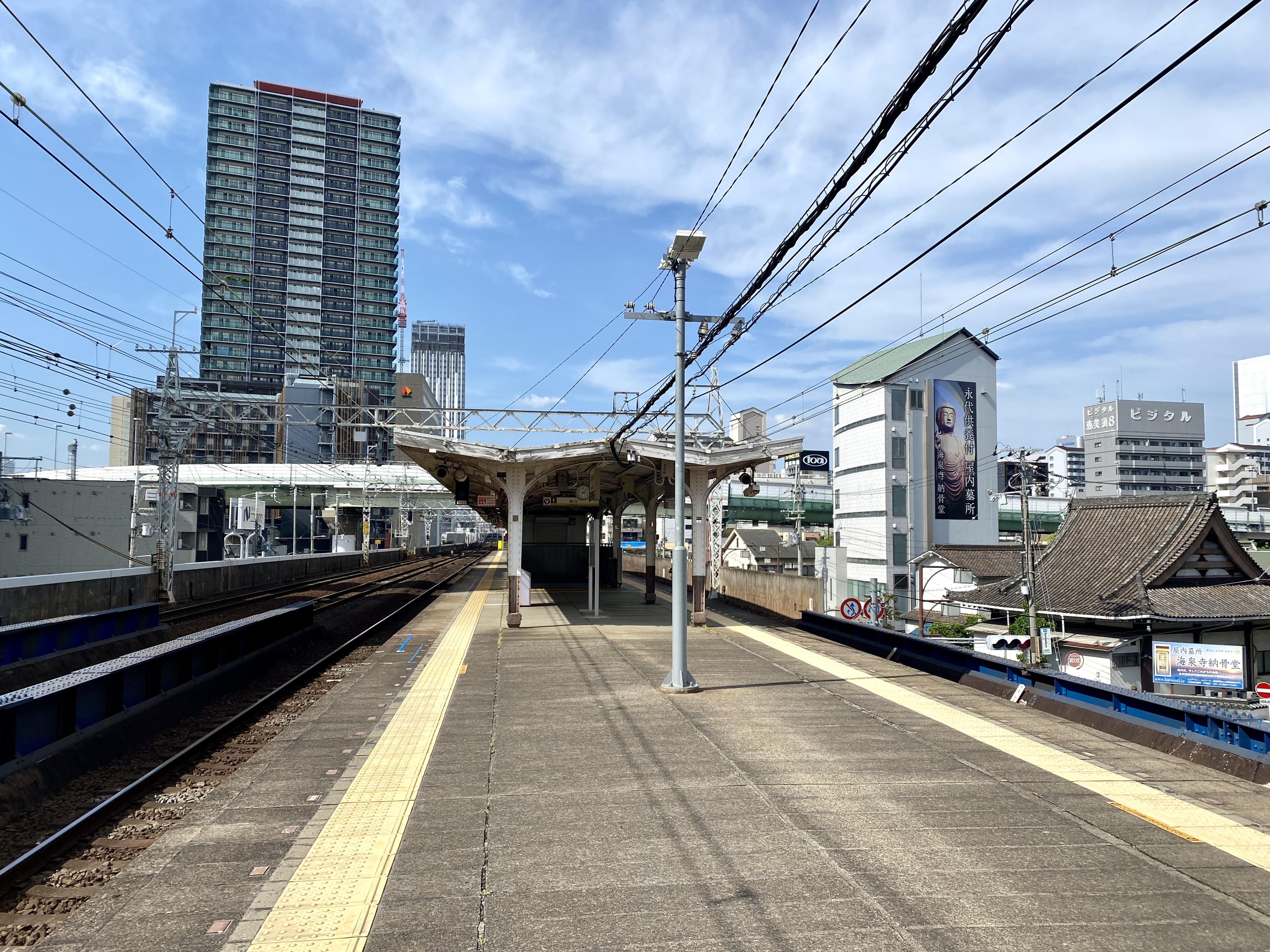 신이마미야역과의 거리가 500m밖에 되지 않아, 이 역 승강장에서 신이마미야역 승강장과 거기에 정차해 있는 열차가 보인다.