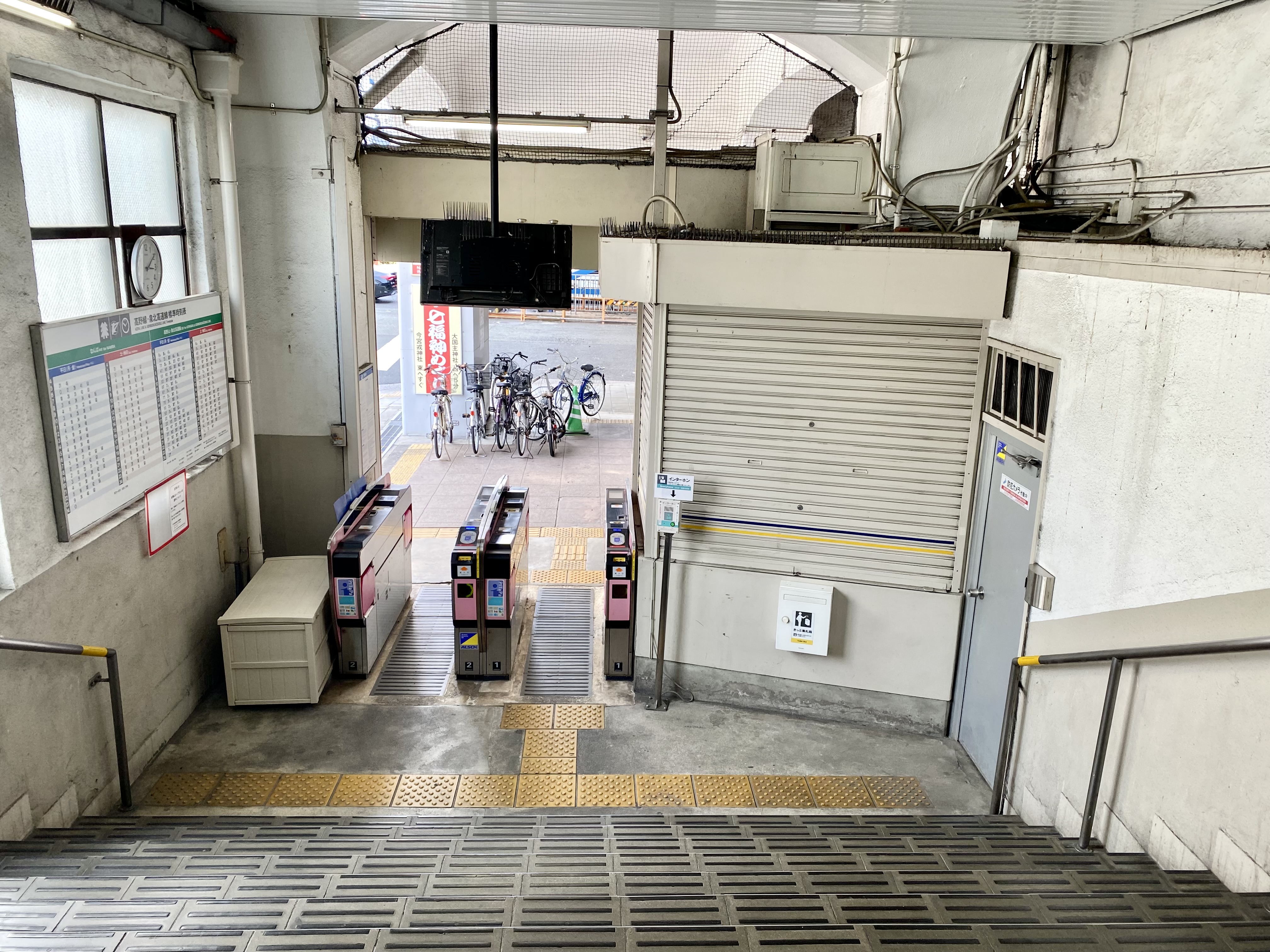 승강장이 동쪽으로 약간 돌출되어 있어 하행선이 동쪽으로 약간 곡선을 이루고 있으며, 통과 열차는 속도 제한을 받는다. 무인역이어서 매표 창구는 폐쇄되어 있다. 2층에 승강장이 있고, 1층 신이마미야역 쪽에 개찰구가 있다. 화장실은 개찰구 안에 있으며, 남녀 구분된 수세식이다.