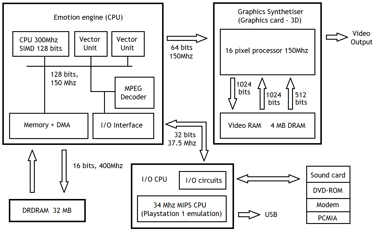 메모리 관리 장치, RDRAM 컨트롤러, DMA 컨트롤러는 시스템 내에서 메모리 접근을 처리한다.[5] 이모션 엔진은 DMA 컨트롤러를 통합하고 있으며, 내부의 각 유닛을 128비트 버스로 연결한 세계 최초의[11] 완전한 128비트 프로세서이기도 하다. 메인 메모리와는 램버스사의 Direct RDRAM 인터페이스 2채널에 의해 3.2 GBps의 메모리 대역폭으로 연결되어 있다.2. 5. 내부 데이터 버스