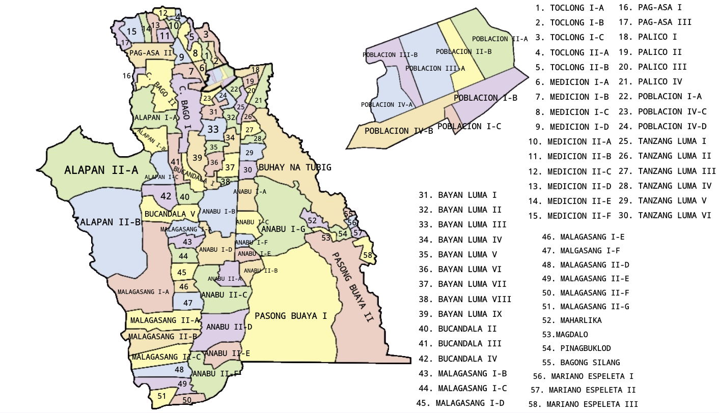 이 바랑가이들은 이무스 서부와 이무스 동부라는 두 개의 지방 및 국가 선거구로 묶여 있으며, 각 선거구는 해당 지역의 대표 및 시의원이 의회에서 대표한다.[15] 1998년, 이 지역은 21개의 바랑가이로 구성되어 있었으며, 이후 이 바랑가이들이 현재의 97개로 세분화되었다.[15] 여러 조각으로 나뉜 바랑가이들은 원래 바랑가이 이름을 사용하며, 이름이 숫자로 끝나는 경우 대문자로 구분한다.[15] 예를 들어 Medicion 1은 Medicion 1-A, Medicion 1-B 등으로 세분화된다.[15] 문자로 끝나는 이름(Bucandala, Bayan Luma 등)은 숫자로 구분된다(Bucandala 1, Bayan Luma 2 등).[15] 이 규칙의 유일한 예외는 바랑가이 부하이 나 투비그(Barangay Buhay na Tubig)와 마리아노 에스펠레타 I~III, 피나그부클로드, 마그달로, 마할리카, 바하양 파그-아사(이후 "바공 실랑"으로 이름 변경)를 포함하는 바하양 파그-아사 구획 내의 바랑가이들이다.[15]
