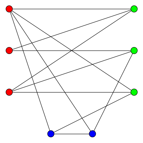 - 완전 이분 그래프 ''Kn,m''은 ''m''개와 ''n''개의 정점을 갖는 두 그룹 사이의 모든 연결을 나타내는 그래프이다.[11]