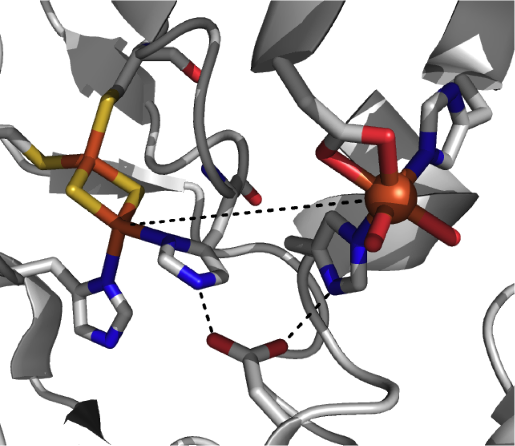 각 α-서브유닛 내에서 철-황 클러스터([2Fe-2S] Rieske 클러스터)와 단핵 철 중심은 약 43 Å 떨어져 있어 효율적인 전자 전달이 일어나기에는 거리가 너무 멀다. 대신, 전자는 인접한 서브유닛에 있는 이 두 중심을 통해 전달되는 것으로 보인다. 즉, 한 서브유닛의 철-황 클러스터가 약 12 Å 거리에 있는 인접 서브유닛의 단핵 철 중심으로 전자를 전달하는 방식이다. 이 거리는 효율적인 전자 전달에 적합해 보이지만, 두 중심 사이를 연결하는 아스파르테이트 잔기를 다른 아미노산으로 바꾸면 효소 기능이 사라진다. 이는 전자 전달이 이 아스파르테이트 잔기에 의해 유지되는 수소 결합 네트워크를 통해 일어날 수도 있음을 시사한다.[5]