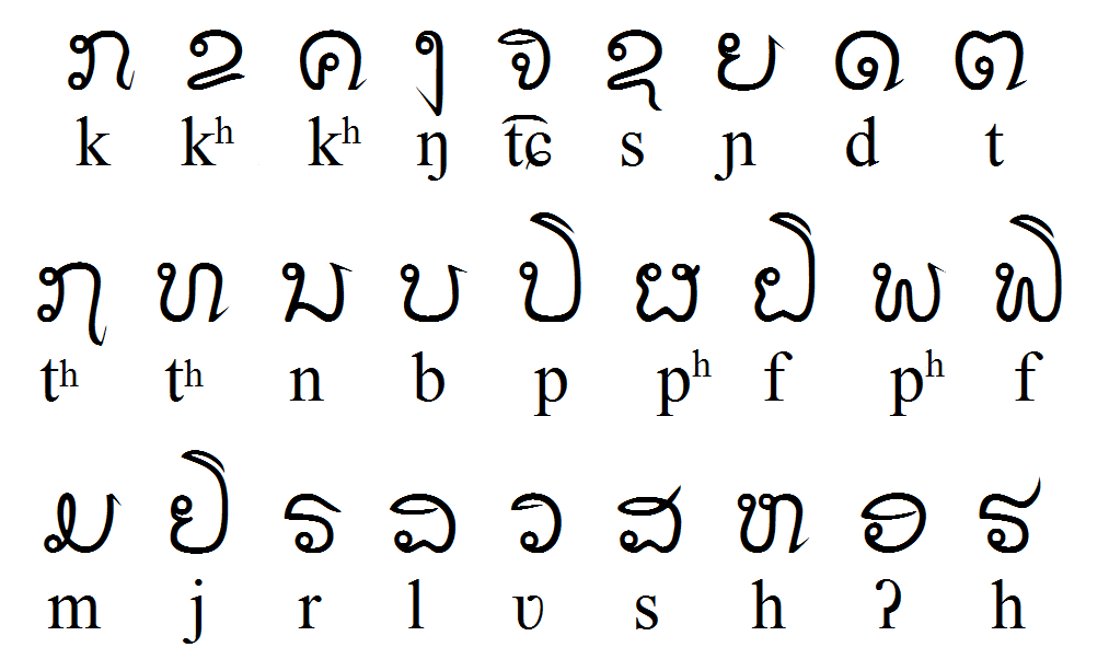 발음에서 모든 파열음(성문 파열음 제외)은 무성음이다. 결과적으로 최종 자음의 유성음화나 공기의 방출이 없다. 따라서 최종 /p/, /t/, /k/는 각각 , , 로 발음된다.[7]style="font-weight:normal;" | 순음 치경음 연구개 파열음 연구개음 성문음 비음 /m/ /n/ rowspan="6" | /ŋ/ rowspan="3" style="text-align:left;" | ม ญ, ณ, น, ร, ล, ฬ ง ມ น, ร, ล ງ 파열음 /p/ /t/ /k/ /ʔ/ บ, ป, พ, ฟ, ภ จ, ช, ซ, ฌ, ฎ, ฏ, ฐ, ฑ, ฒ, ด, ต, ถ, ท, ธ, ศ, ษ, ส ก, ข, ค, ฆ * บ, ป, พ, ฟ จ, ส, ช, ต, ถ, ท, ด ก, ข, ค 접근음 /w/ rowspan="3" colspan="2" | /j/ rowspan="3" colspan="3" | ว ย ວ ຍ