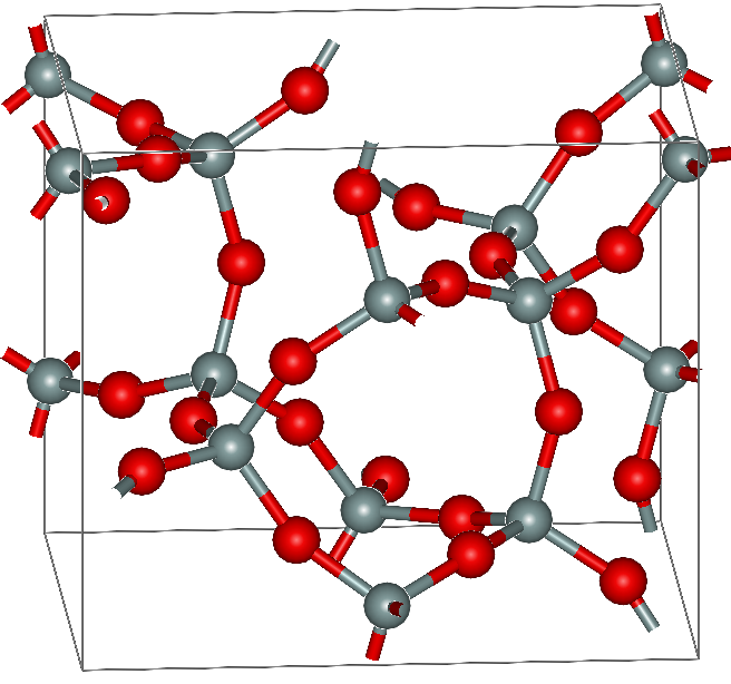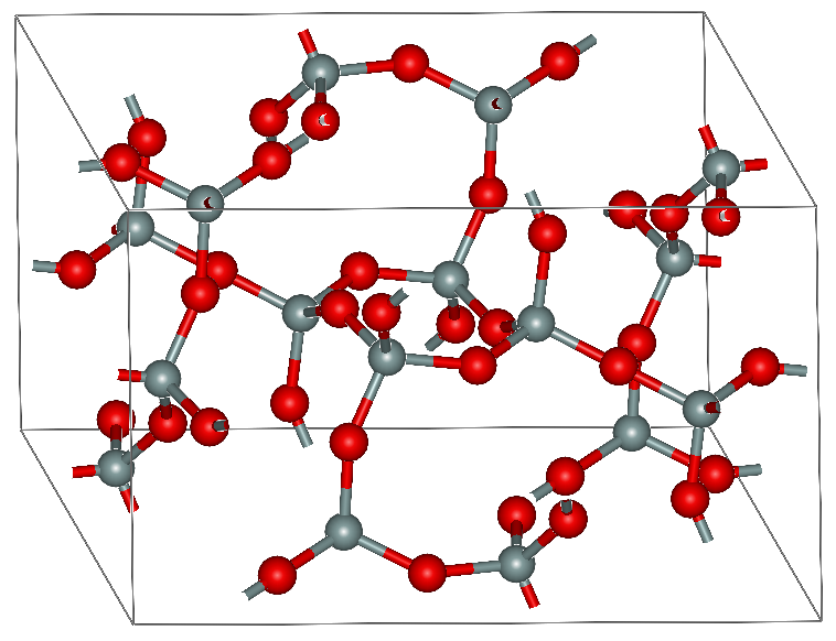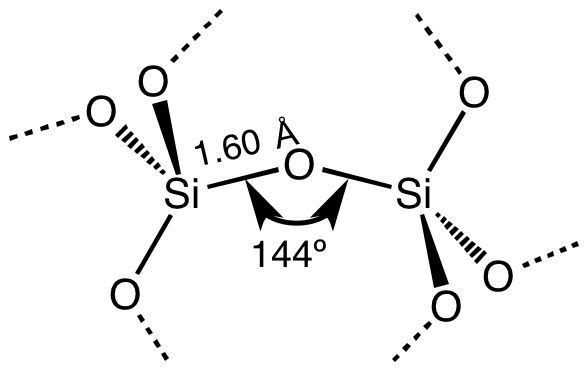 대부분의 이산화 규소에서 규소 원자는 사면체 배위를 나타내며, 4개의 산소 원자가 중앙의 Si 원자를 둘러싸고 있다.[7][8] SiO2는 각 규소 원자가 4개의 산소 원자와 사면체 방식으로 공유 결합을 하는 3차원 네트워크 고체를 형성한다.[7][8]