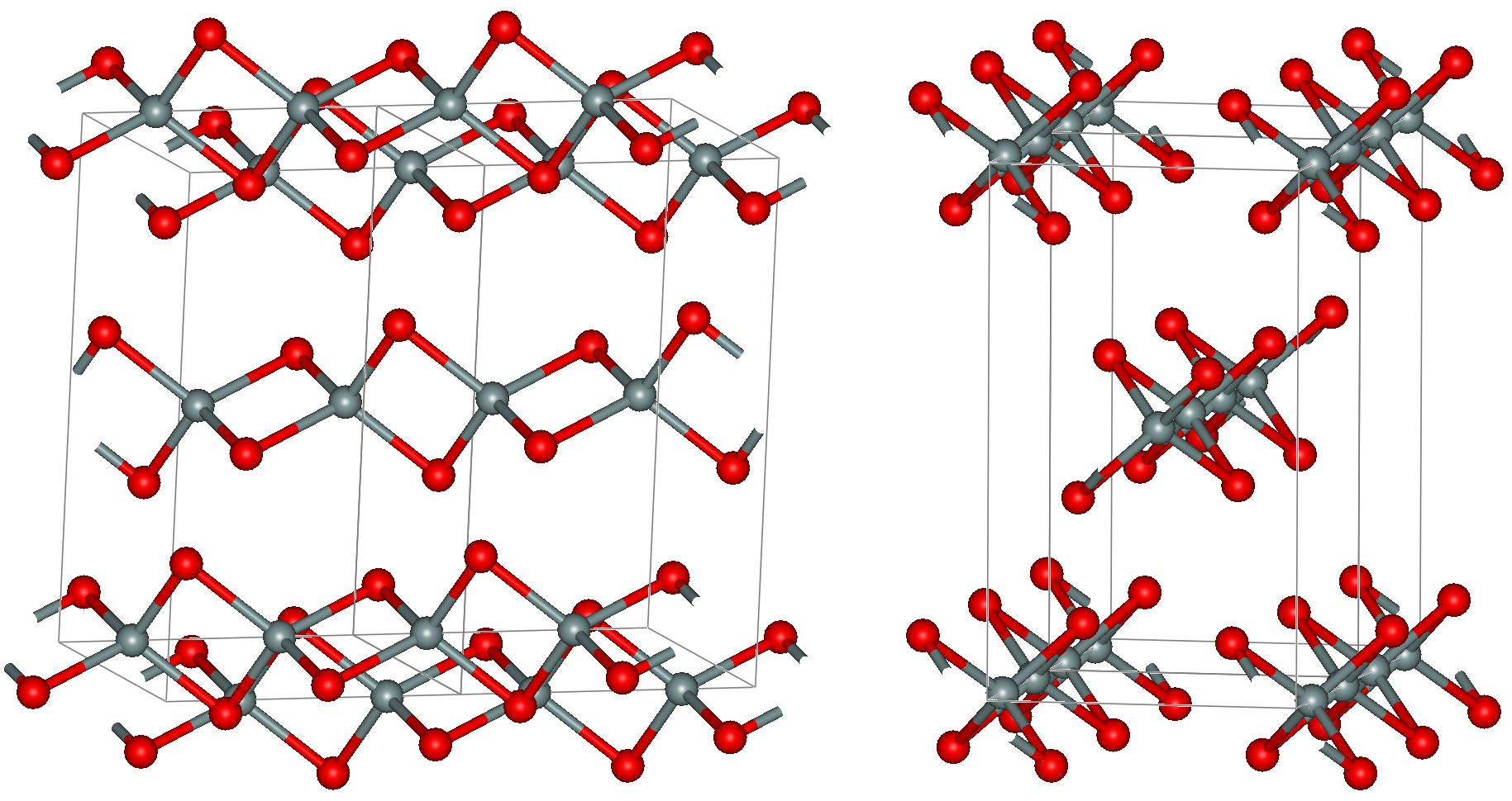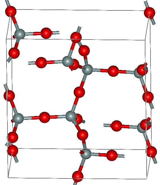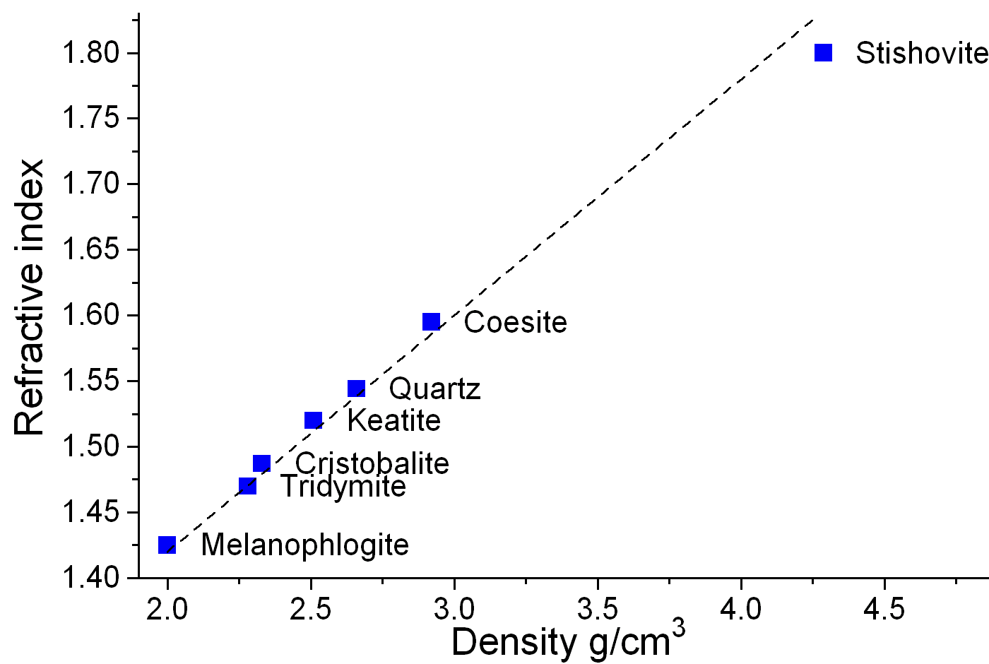 스티쇼바이트 | 정방정계 tP6, P42/mnm, No.136[92] | 4.287 | ![]() | 초고압 조건 (10 GPa 이상, 1200℃)에서 생성,[114] 운석 충돌 크레이터에서 발견,[115][116] 지구 맨틀 전이층~하부 맨틀 환경에서 안정[119][120][121] |