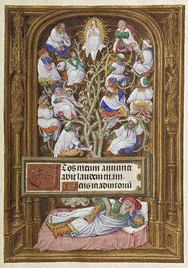 초기 사례로는 12세기 후반 헌팅필드 시편이 있으며, 14세기 초 대영 도서관의 고르레스턴 시편이 훌륭한 예시이다.[12] 이들과 대부분의 예에서 이새는 B 하단에 누워 있고, 성모는 다른 인물보다 크지 않다. 1320년경 재발견된 맥클스필드 시편에서는 또 다른 정교한 나무[13]가 B를 넘어 자라나 텍스트 측면과 하단으로 가지를 뻗고 있다. 1420-23년경 존 오브 랭커스터, 제1대 베드퍼드 공작의 시편과 기도서(대영 도서관 Add MS 42131)에서 나무는 페이지 하단과 양쪽을 프레임으로 장식하고, 페이지 상단 B 머리글자에는 "다윗 왕의 도유"가 있다.