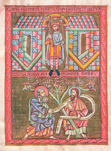 12세기 수도승 에르베우스는 불가타 성경 텍스트를 기반으로 이사야의 예언에 따라 뻗어 나가는 가지가 있는 상징적인 나무 또는 덩굴을 그린 '이새의 나무'를 다음과 같이 설명했다. "족장 이새는 왕족에 속했는데, 이것이 이새의 뿌리가 왕의 계보를 의미하는 이유이다. 막대기는 성모 마리아를 상징하며, 꽃은 예수 그리스도를 상징한다."[1]