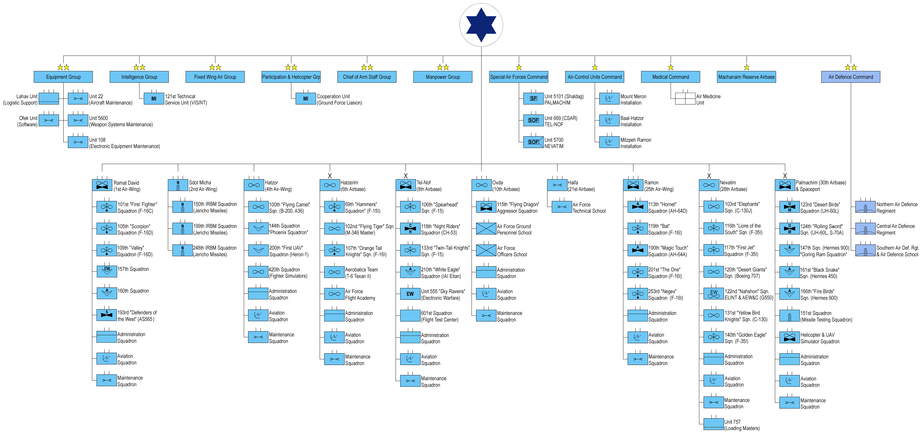 1970년대 이후 미국으로부터 F-4 팬텀 II, F-15 이글, F-16 파이팅 팰컨 등 다양한 군용기를 도입하여 전력을 강화했으며, 1981년에는 오페라 작전을 통해 이라크의 핵 시설을 공격하기도 했다. 2000년대 이후에는 가자 지구 분쟁, 시리아 내전 등에서 활동하며, F-35 라이트닝 II를 도입하여 최신예 전투기 전력을 구축했다. 현재 이스라엘 공군은 F-15, F-16, F-35 등 다양한 전투기, 조기경보통제기, 정찰기, 수송기, 헬리콥터, 무인 항공기 등 다양한 항공 전력을 보유하고 있으며, 총사령관은 소장(2성 장군)이 맡는다. 조종사 선발은 엄격한 과정을 통해 이루어지며, 여성 조종사도 배출하고 있다.