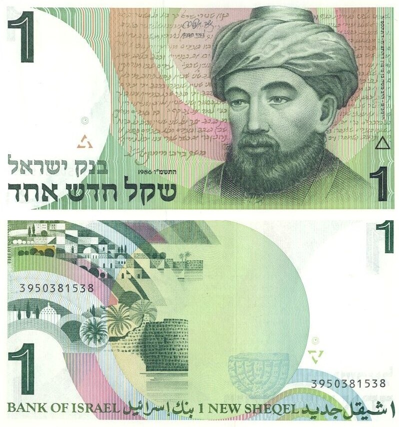![]() | 1 셰켈(₪) | 138 × 76 mm | 녹색 | 마이모니데스 | 마이모니데스가 묻힌 티베리아스; 고대 석등 | 1986년 5월 8일 | 1995년 |