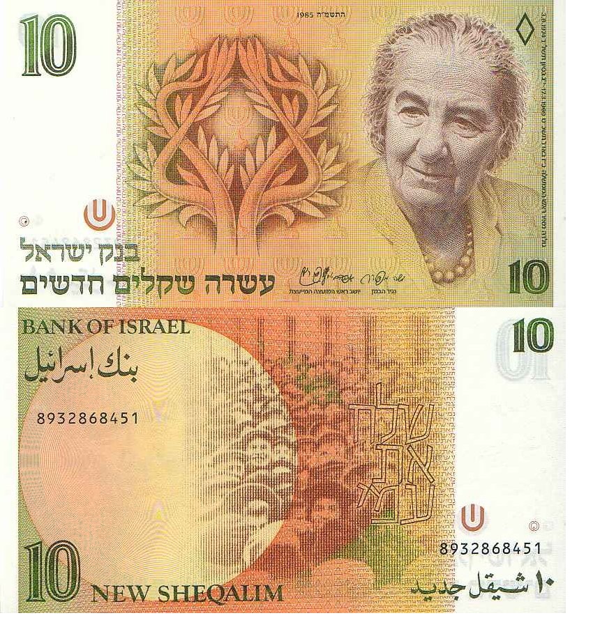 10 셰켈(₪) | 주황색 | 골다 메이어 | 1948년 이스라엘 대사로 모스크바에 도착했을 때 군중 속에 있는 골다 메이어의 사진, 모스크바 코랄 시나고그 앞 | 1985년 9월 4일 | 1995년 | ||