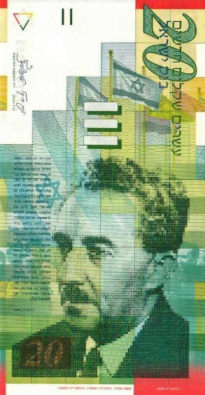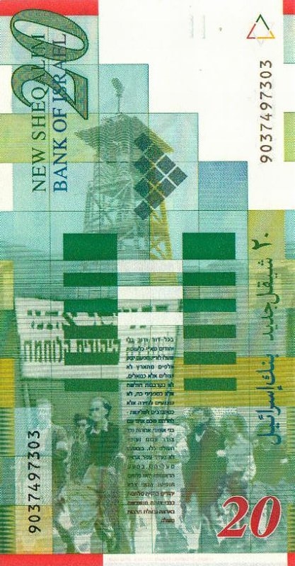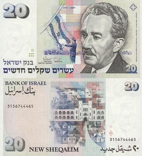 20 셰켈(₪) | 짙은 회색 | 모셰 샤레트 | 헤르츨리야 김나지움의 원래 건물, 배경의 작은 텔아비브 | 1988년 4월 2일 | 2000년 7월 1일 | ||