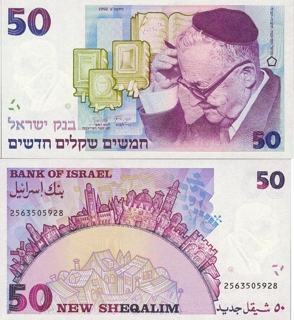 50 셰켈(₪) | 보라색 | 슈무엘 요세프 아그논 | 예루살렘 스카이라인, 아그논의 많은 이야기의 배경인 동유럽 슈테틀 | 1985년 9월 4일 | 2000년 7월 1일 | ||