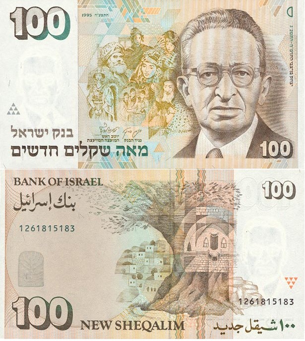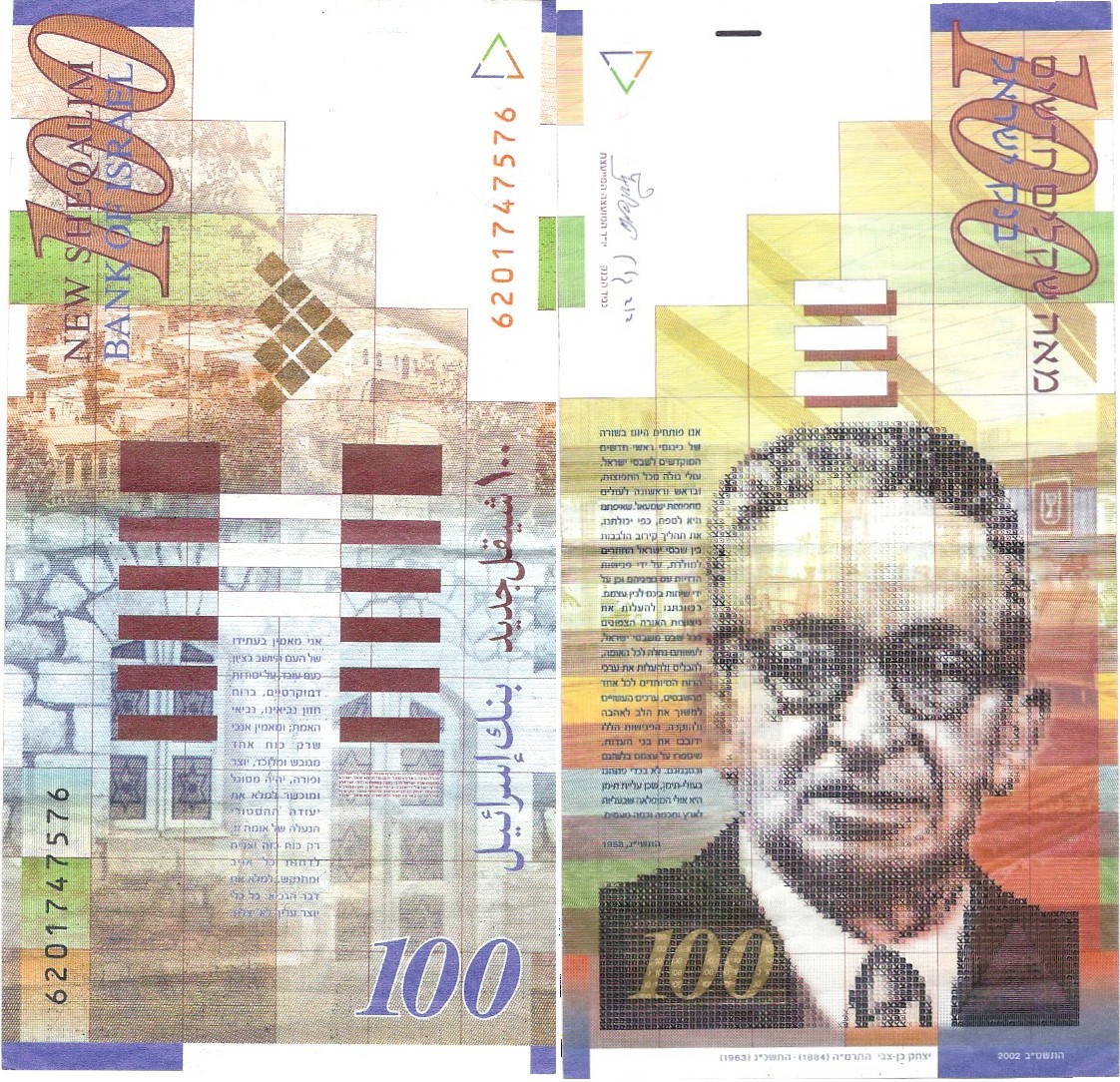 ![]() | 100 셰켈(₪) | 갈색 | 이츠하크 벤츠비 | 페키인 시나고그와 캐럽 나무, 동굴; 고대 석등 | 1986년 8월 19일 | 2000년 7월 1일 | |
