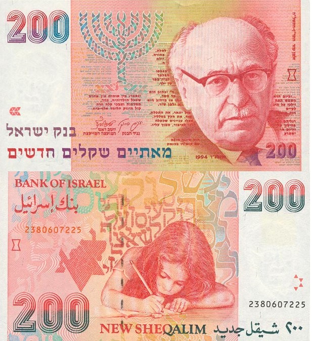 ![]() | 200 셰켈(₪) | 빨간색 | 잘만 샤자르 | 샤자르가 시작한 의무 교육법을 상징하는 책상에서 글을 쓰고 있는 소녀, 배경의 히브리어 블록 문자 | 1992년 2월 16일 | 2000년 7월 1일 |