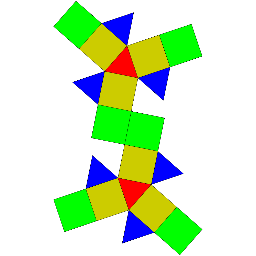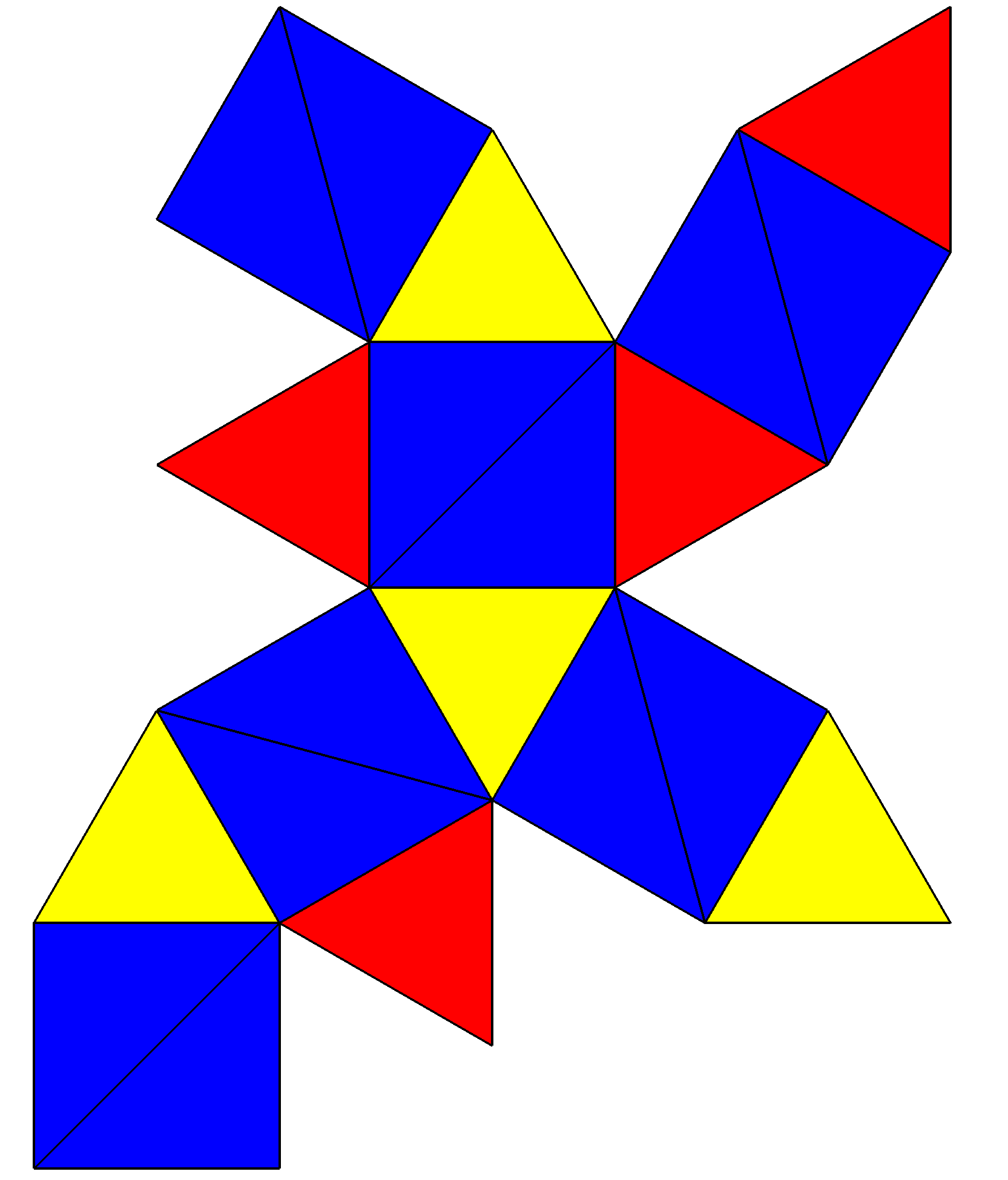 16개의 삼각형 3개의 정사각형 1개의 육각형 | 8개의 삼각형 12개의 정사각형 | 8개의 삼각형 12개의 정사각형 | 10개의 삼각형 10개의 오각형 | 10개의 삼각형 10개의 오각형 | 13개의 삼각형 3개의 정사각형 3개의 오각형 1개의 육각형 |