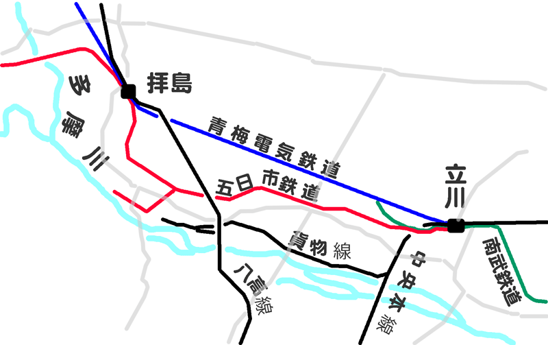 과거에는 무사시이쓰카이치역에서 하이지마역 방면의 산나이 신호취급소까지 되돌아가 스위치백 방식으로 무사시이와이역으로 향하는 이와이 지선(정식 명칭은 본선의 말단 구간)이 있었으나 폐선되었다. 현재 이 구간은 니시도쿄 버스의 무사시이쓰카이치역 - 마쓰오·쓰루쓰루 온천 간 노선 버스가 대체 운행하고 있다. 무사시이쓰카이치역은 폐선 부지를 활용하여 고가화 및 개축되었으며, 역 앞에 일부 남아 있는 폐선 부지는 보선 작업용 기계 유치 등에 사용되고 있다.