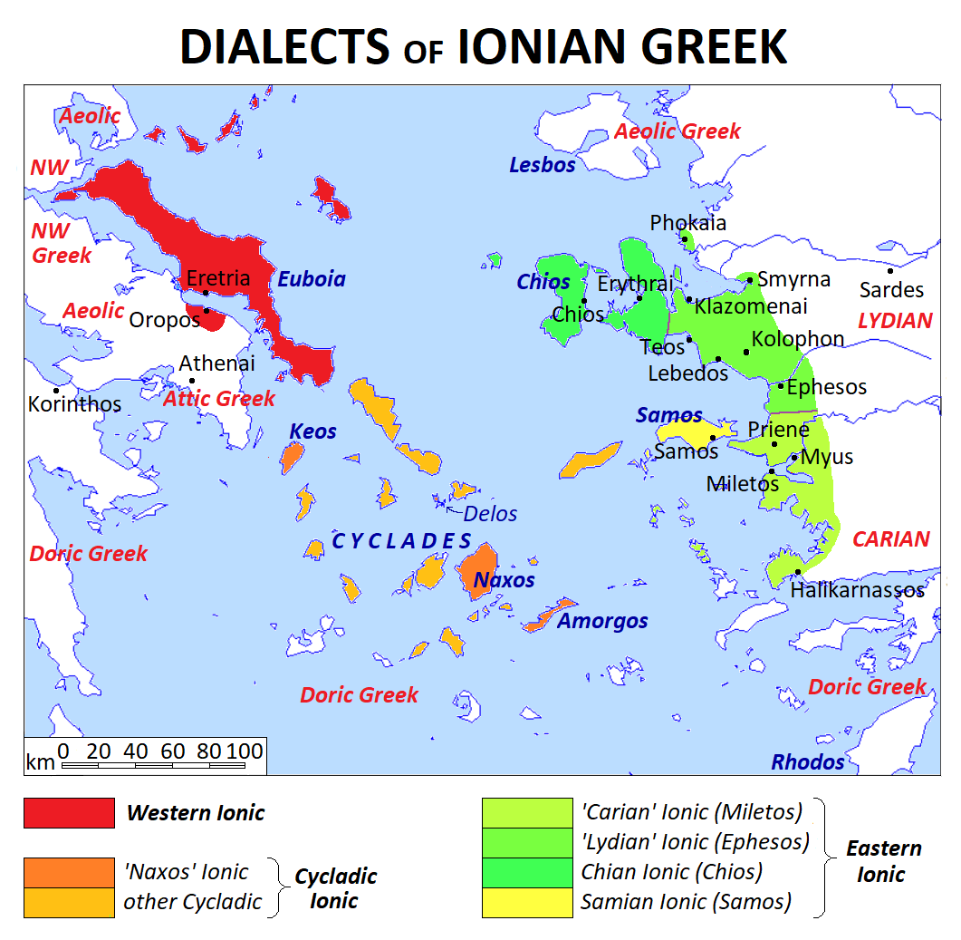 c. 키오스와 에리트라이 그리고 그 식민지의 방언은 아이올리아 그리스어의 영향을 받았다.