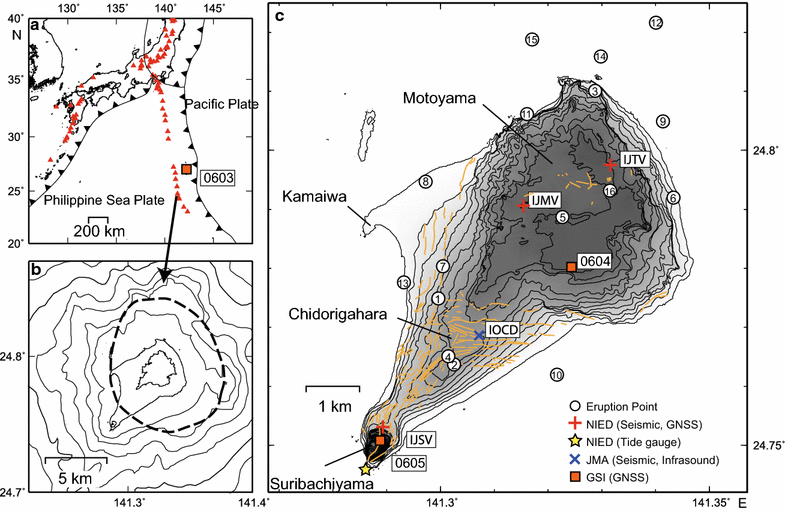 섬의 북서쪽 약 15km 해저에 있는 해세이니시노바와 섬의 남쪽 약 20km 해저에 있는 해신 해구에도 화산 활동 기록이 있지만, 자세한 내용은 알려져 있지 않다.[71]
