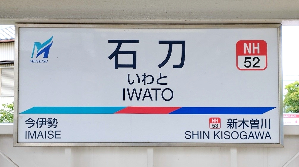 나고야 철도 나고야 본선에서 뮤 스카이, 쾌속 특급, 특급, 쾌속급행, 급행, 준급 열차는 통과한다. 보통 열차는 이마이세역 (NH51) - '''이와토역 (NH52)''' - 신키소카와역 (NH53) 순으로 정차한다.
