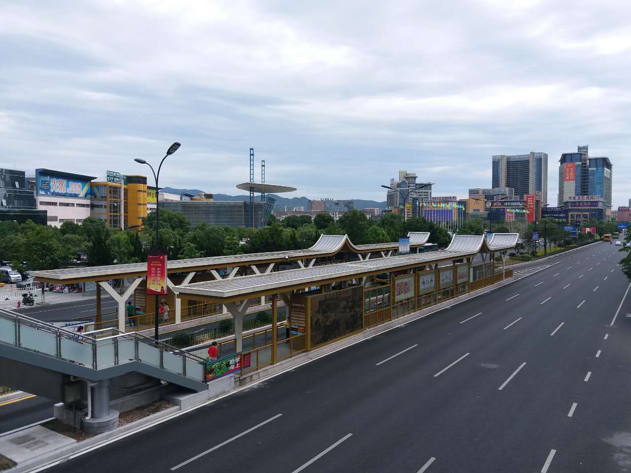푸톈 시장 1구역 앞의 이우 버스 급행 수송 시스템 정류장