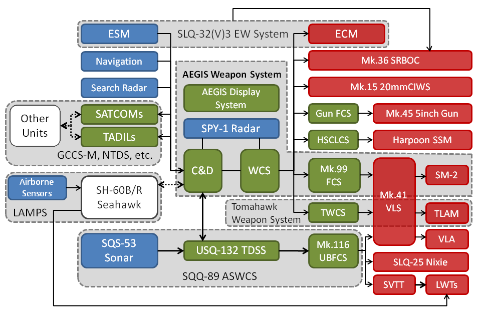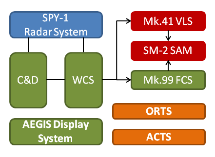 - 무기 통제 시스템 (WCS: Weapon Control System): C&D의 결정에 따라 사용할 무기를 선택하고 발사 명령을 내리며, 미사일의 중간 유도를 담당한다.