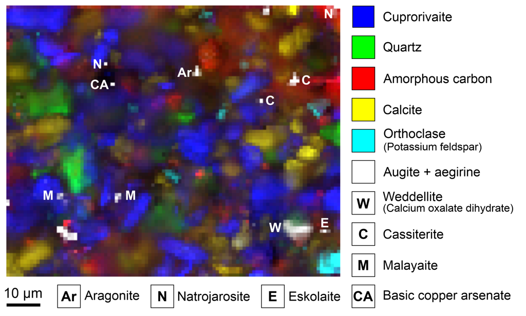 이집션 블루는 최종 상태에서 직사각형의 푸른색 결정과 반응하지 않은 석영, 약간의 유리를 포함한다. 이론적인 쿠프로리바이트를 얻기 위해서는 이산화 규소 64%, 산화 칼슘 15%, 산화 구리 21%의 비율이 사용되어야 한다.[13] 그러나 고대에서 분석된 표본 중 이 정확한 조성을 가진 것은 없었으며, 모두 이산화 규소가 과량 함유되어 있었고 CuO 또는 CaO가 과량 함유되어 있었다.[14]