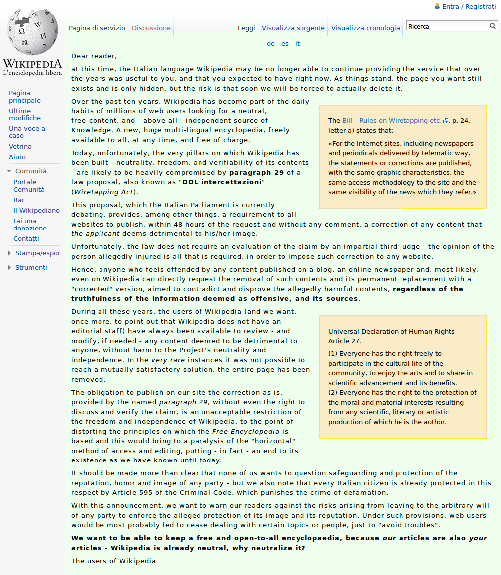 2011년 10월 4일부터 6일까지 이탈리아어 위키백과는 이탈리아 의회에서 논의 중이던 도청 법안(''DDL intercettazioni'')에 항의하며 지식 블랙아웃을 시행했다.[10] [11] 이 기간 동안 이탈리아어 위키백과의 모든 페이지는