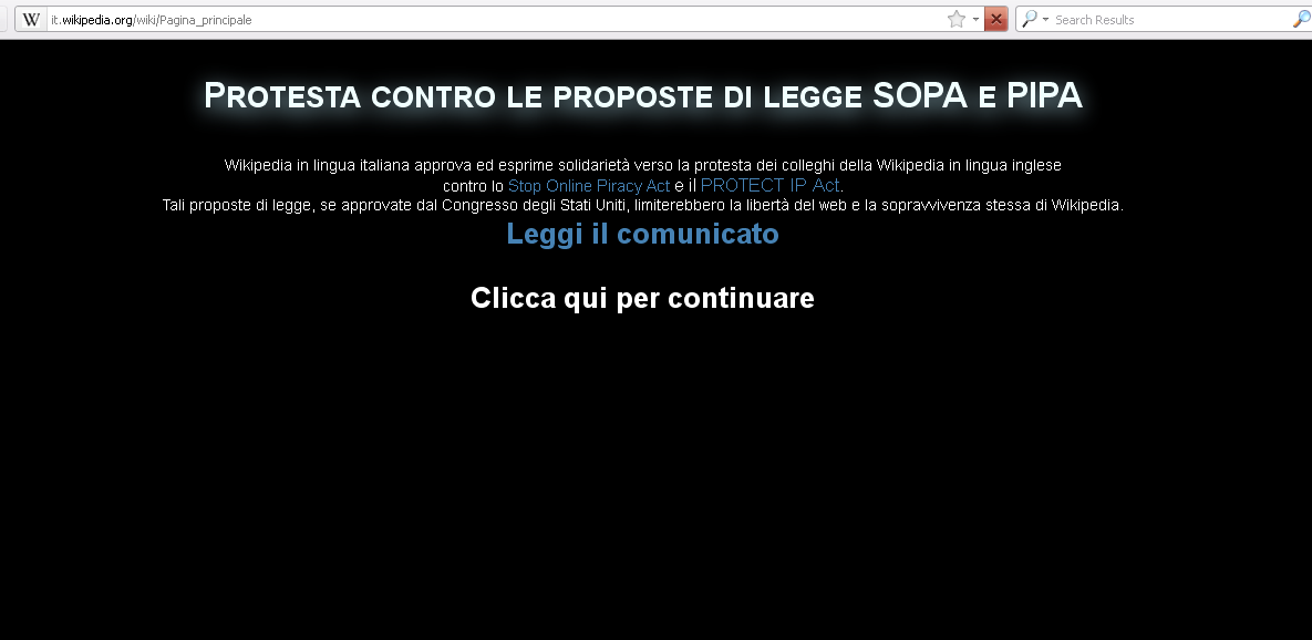 영어 위키백과는 2012년 1월 18일 미국 의회에서 검토 중인 온라인 불법 복제 방지법(SOPA)과 지식 재산 보호법(PIPA)에 항의하기 위해 24시간 동안 폐쇄되었다. 같은 날 이탈리아어 위키백과는 자체 메인 페이지에서 사용자들을 영어 위키백과의 결정에 대한 지지 메시지가 담긴 검은색 페이지로 리디렉션했다. 사용자들은 클릭을 통해 이탈리아어 위키백과의 콘텐츠에 정상적으로 접근할 수 있었다.4. 3. 2012년 러시아 법안 반대