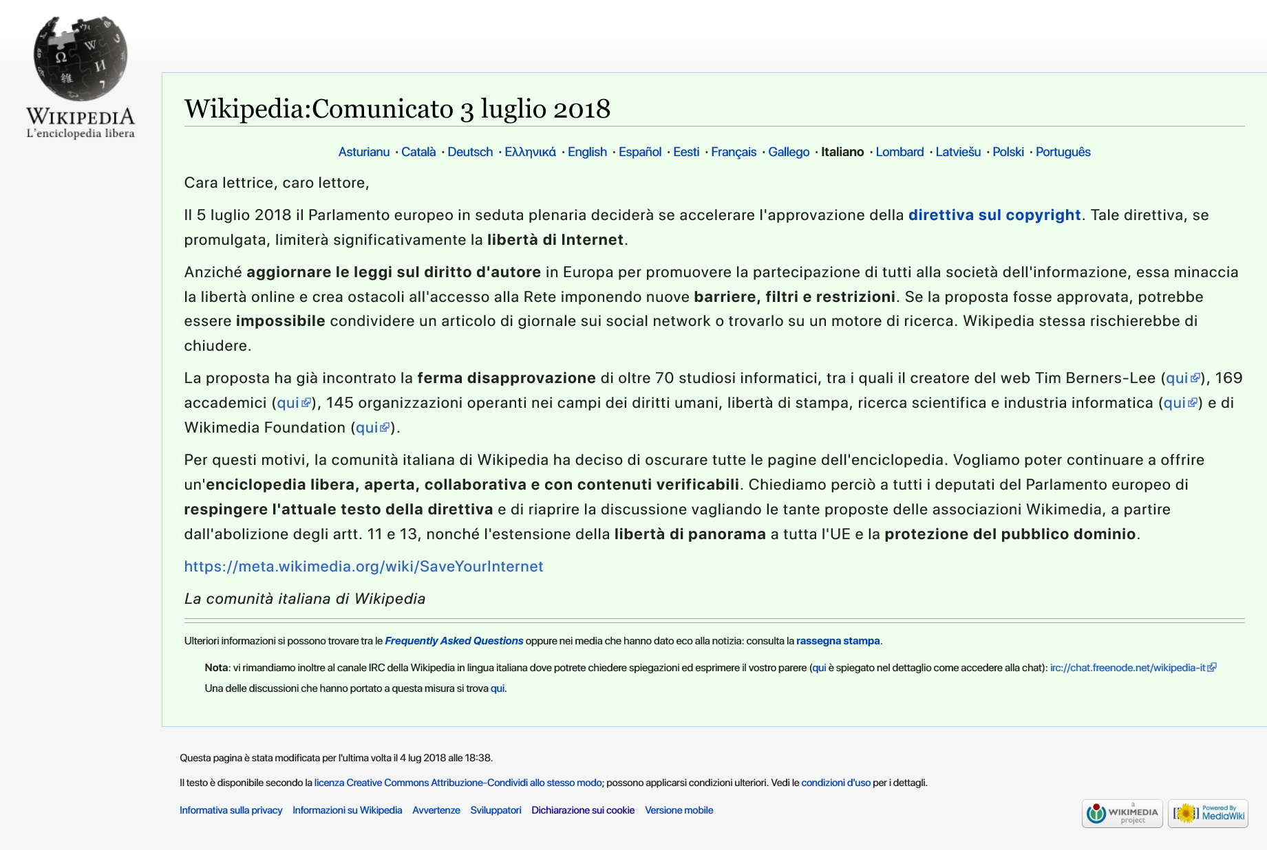 2012년 7월 10일, 러시아 위키백과가 러시아 국가 두마의 "정보에 관한" 법률 개정안에 항의하기 위해 폐쇄되었을 때, 이탈리아어 위키백과는 항의를 지지하는 사이트 전체 배너를 표시했다.[19]4. 4. 2018년 유럽 저작권 지침 반대