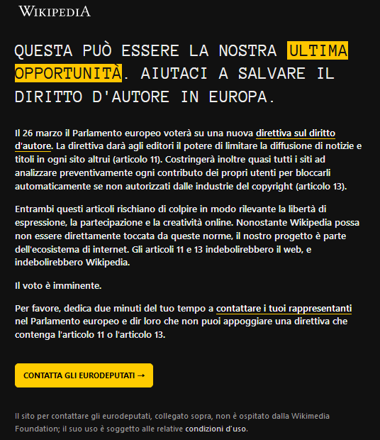 2019년 3월 25일부터 24시간 동안, 이탈리아어 위키백과는 유럽 저작권 지침의 제11조와 제13조에 반대하는 메시지를 표시하고 콘텐츠 접근을 제한했다.[22][23] 이 메시지는 독자들이 유럽 의회 의원들에게 연락하여 해당 지침에 반대 투표를 하도록 독려했다.