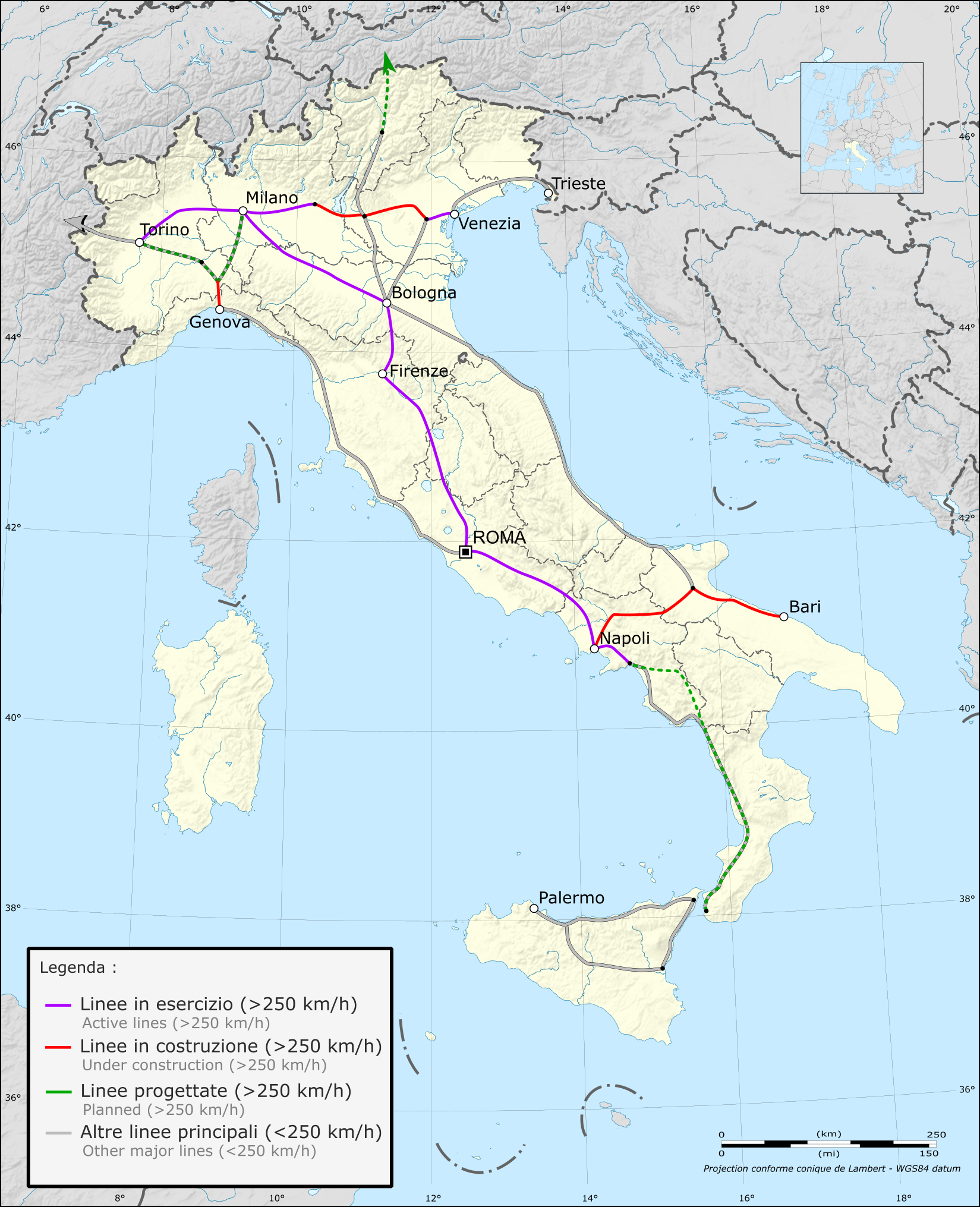 제안된 다른 고속 철도 노선으로는 살레르노-레조 칼라브리아[22] (미래의 메시나 해협 다리[23]로 시칠리아와 연결), 팔레르모-카타니아[24] 및 나폴리-바리[25]가 있다. 밀라노-베네치아 고속선 건설은 2013년에 시작되어 2016년 12월 밀라노-트레빌리오-브레시아 구간이 개통되었고,[27] 밀라노-제노바 고속선(Terzo Valico dei Giovi)도 건설 중이다.