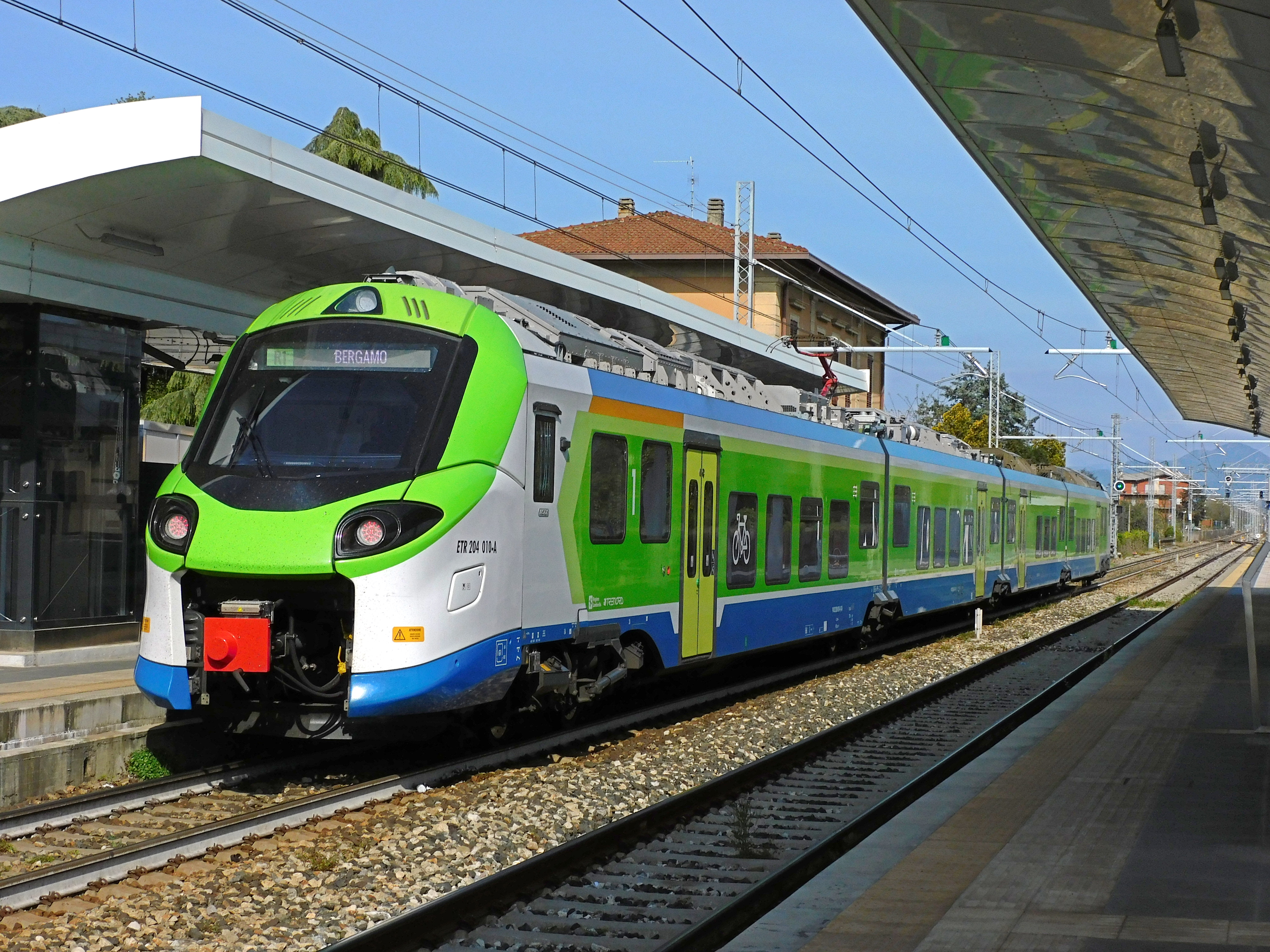 트레노르드(Trenord) 도니제티 TN 204가 팔라촐로 술리오 기차역에 도착한다.
