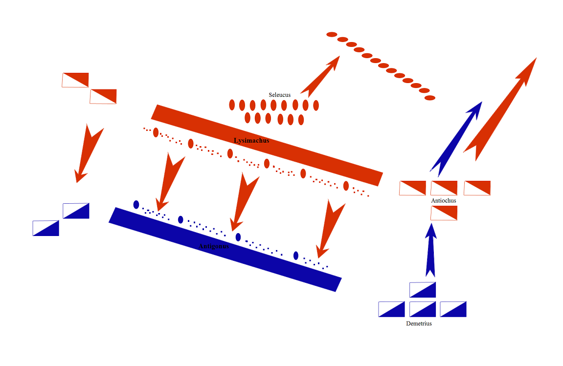 한편, 셀레우코스-리시마코스 연합군은 셀레우코스가 찬드라굽타(산드로코토스)와의 협정을 통해 인도 인근 영토를 넘겨주고 얻은 다수의 전투 코끼리를 보유하고 있었다. 연합군은 보유한 코끼리 중 일부(약 100마리로 추정[1])를 전열 앞에 배치했으며, 셀레우코스가 나머지 대부분을 예비대로 두었을 가능성도 제기된다.[1][23] 연합군의 좌익 기병은 셀레우코스의 아들 안티오코스가 지휘했고,[1] 중앙 보병은 셀레우코스가, 우익 기병은 리시마코스가 이끌었다.