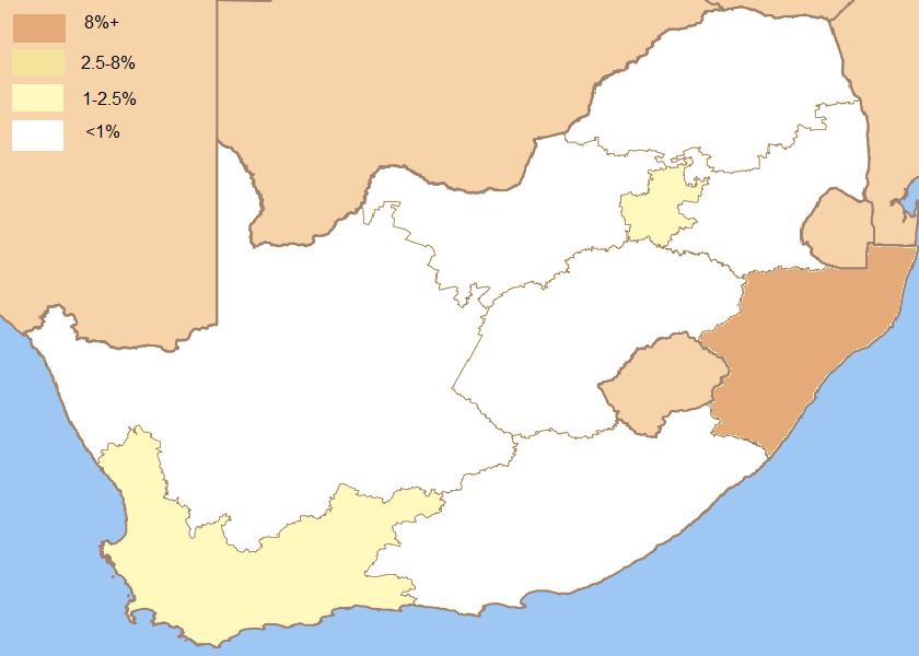 남아프리카 공화국 지방별 인도계 인구 분포(아파르트헤이트 이후).